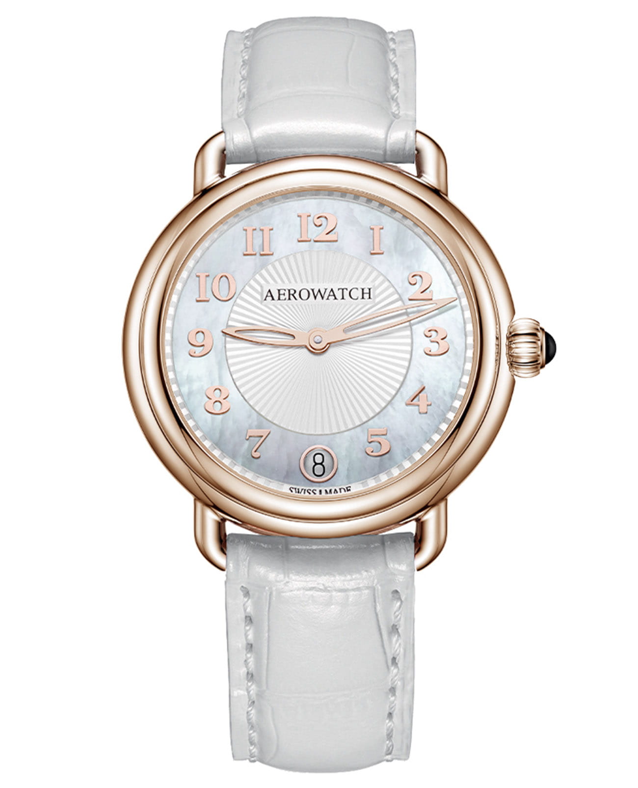 Женские швейцарские часы Aerowatch 1942 42960 RO20, кварцевый механизм с высокой точностью. Сапфировое стеклоСапфировое стеклоПрочный и надёжный материал из кристалла сапфира синтетического происхождения, характеризующийся особой твёрдостью и устойчивостью к царапинам и повреждениям. устойчивое к появлению царапин, обладающее высокой прозрачностью. Корпус изготовлен из нержавеющей стали с PVDPVDУльтратонкое покрытие наносится в технике вакуумного напыления, сочетает в себе нитрид титана особой прочности со слоем золота или оксида хрома. Несёт в себе декоративную или защитную функцию. покрытием. . На циферблате расположены стрелки-скелетоны, окошко даты в положении 6 часов. Класс водозащиты: 50 метров, позволит защитить корпус от случайных брызг или капель дождя. Кожаный ремешок на стандартной застёжке.