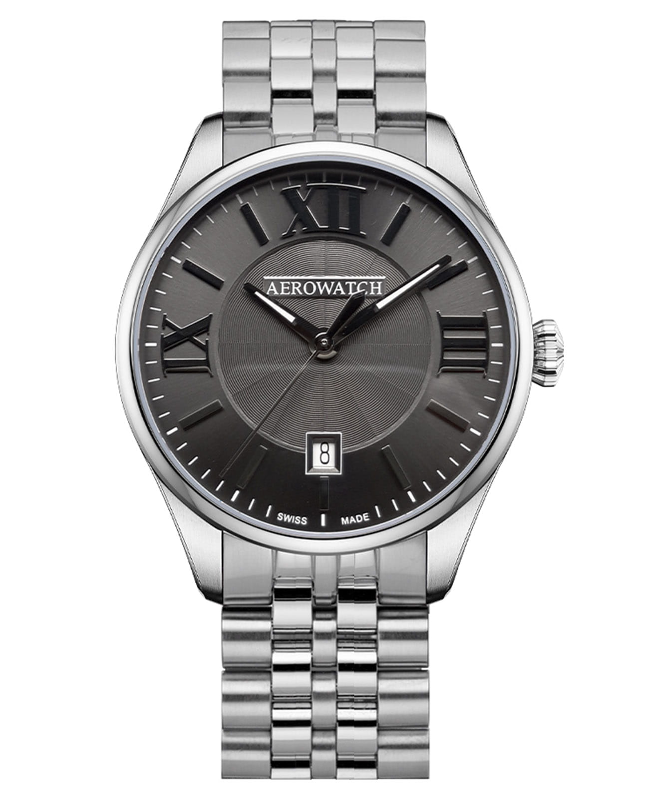 Мужские швейцарские часыAerowatch Les Grandes Classiques 42997 AA02 M, кварцевый механизм с высокой точностью. Сапфировое стеклоСапфировое стеклоПрочный и надёжный материал из кристалла сапфира синтетического происхождения, характеризующийся особой твёрдостью и устойчивостью к царапинам и повреждениям. устойчивое к появлению царапин, обладающее высокой прозрачностью. Корпус и браслет изготовлены из нержавеющей стали. На циферблате расположены стрелки с люминесцентным покрытиемЛюминесцентное покрытиеПозволяет считывать показания времени в темноте. Производители наносят на стрелки, часовые индексы, безель или поверхность циферблата светонакопительный состав, дающий холодное свечение., окошко даты в положении 6 часов. Класс водозащиты: 50 метров, позволит защитить корпус от случайных брызг или капель дождя. Стальной браслет на застёжке «бабочка» с кнопкамиЗастёжка "бабочка"Такой вид застёжки дополняется предохранителями, помогающими избежать случайного раскрытия браслета. Обладают изящным исполнением. .