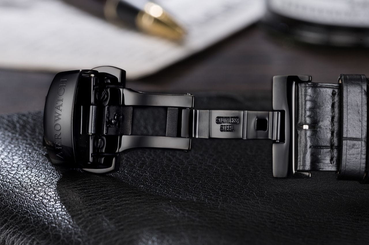 Ремешок выполнен из натуральной кожи чёрного цвета и дополнен раскладывающейся застёжкой. Толщина корпуса составляет 12 мм, что придаёт часам солидный вид.