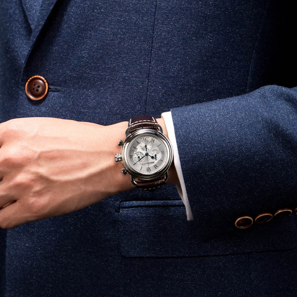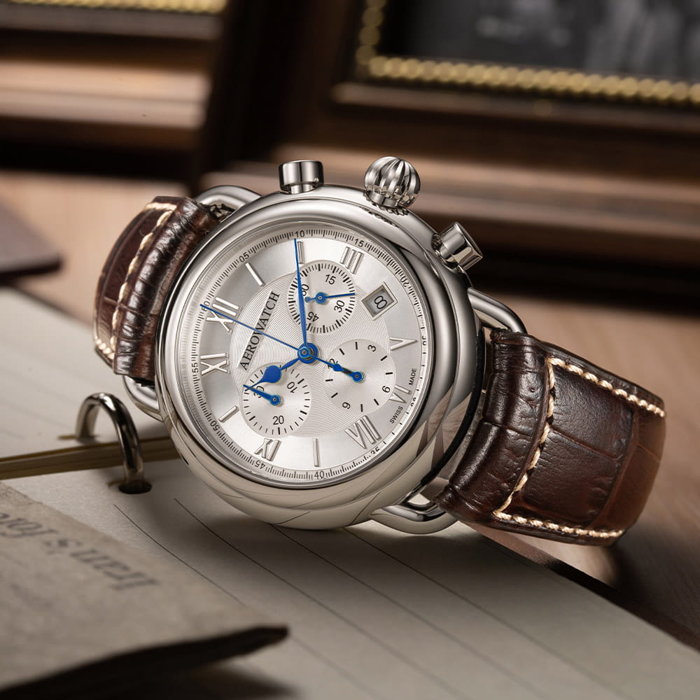 Мужские швейцарские часы-хронографХронографФункция позволяет измерять отрезки времени с особой точностью: часы, минуты, секунды. Верным признаком хронографа является наличие на циферблате 3 дополнительных окошек-счётчиков. Aerowatch 1942 83926 AA07, кварцевый механизм с высокой точностью. Сапфировое стеклоСапфировое стеклоПрочный и надёжный материал из кристалла сапфира синтетического происхождения, характеризующийся особой твёрдостью и устойчивостью к царапинам и повреждениям. устойчивое к появлению царапин, обладающее высокой прозрачностью. Корпус изготовлен из нержавеющей стали. На циферблате расположены 3 счетчика, окошко даты в положении 4 часов. Класс водозащиты: 50 метров, позволит защитить корпус от случайных брызг или капель дождя. Кожаный ремешок на стандартной застёжке.