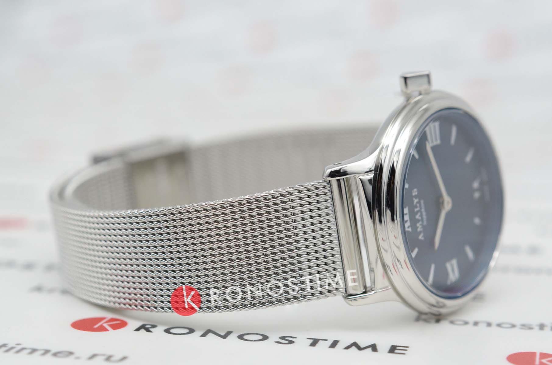 Amalys AMW-166 — женская модель с утончённым классическим дизайном, в которой сочетаются элегантность и практичность. Круглый корпус диаметром 28 мм выполнен из нержавеющей стали, гармонирующим с браслетом шириной 14 мм в том же исполнении. Защитную функцию выполняет сапфировое стеклоСапфировое стеклоПрочный и надёжный материал из кристалла сапфира синтетического происхождения, характеризующийся особой твёрдостью и устойчивостью к царапинам и повреждениям., стойкое к царапинам и сохраняющее прозрачность. Механизм — кварцевый, обеспечивающий точность и стабильность хода. Браслет миланского плетения снабжён раскладным замкомРаскладной замокДанный вариант застежки используется только на часах с металлическим браслетом. Отличительная особенность такого крепления в том, что длина браслета становится универсальной и вы можете самостоятельно отрегулировать нужный вам размер – застежка просто двигается по браслету часов., который сочетает надёжность фиксации и удобство повседневного использования. Водозащита 5 ATM защищает часы от случайных брызг и дождя. Циферблат с римскими индексами и изящными стрелками подчёркивает классическую эстетику модели, делая её уместной как в повседневных образах, так и в торжественной обстановке.