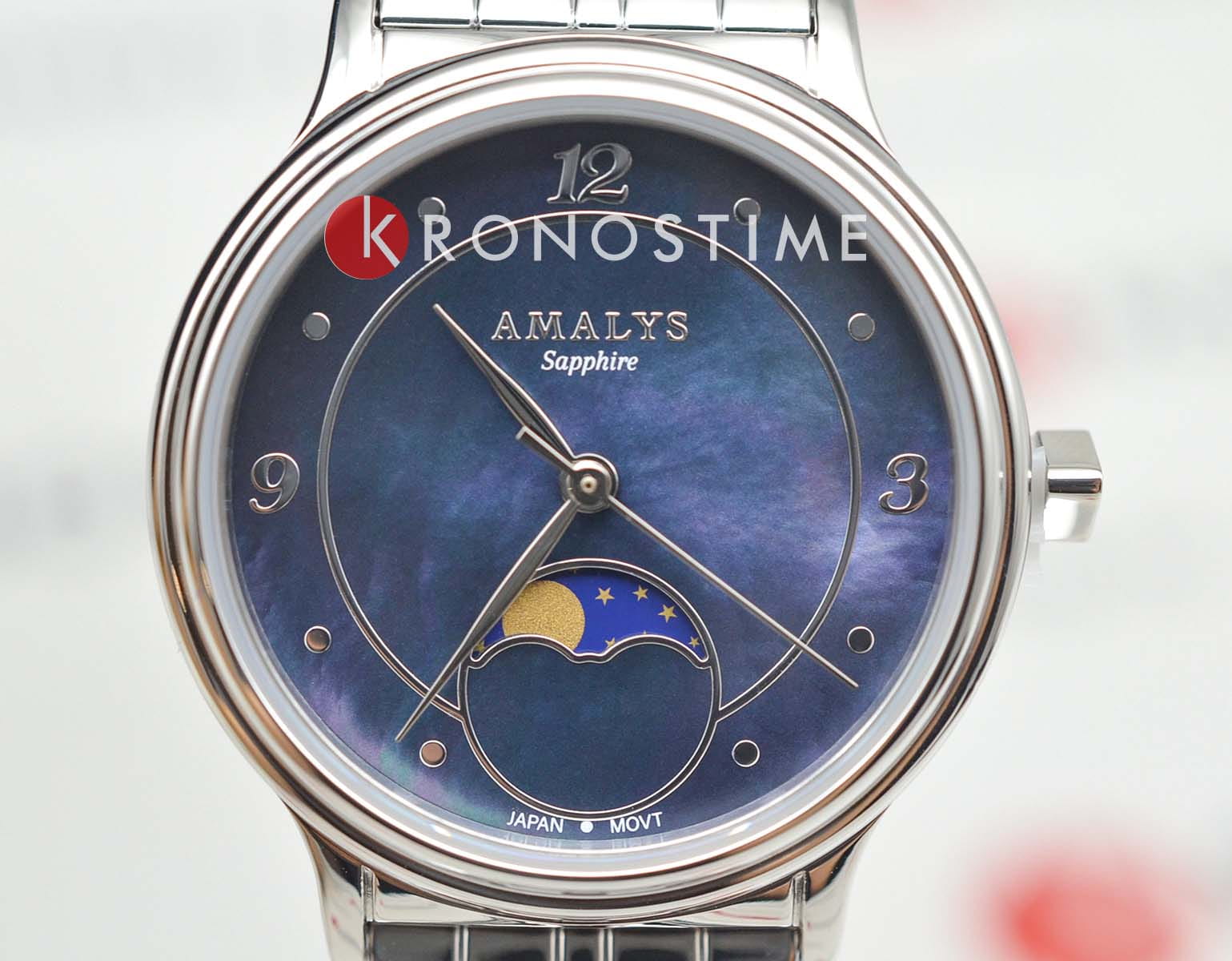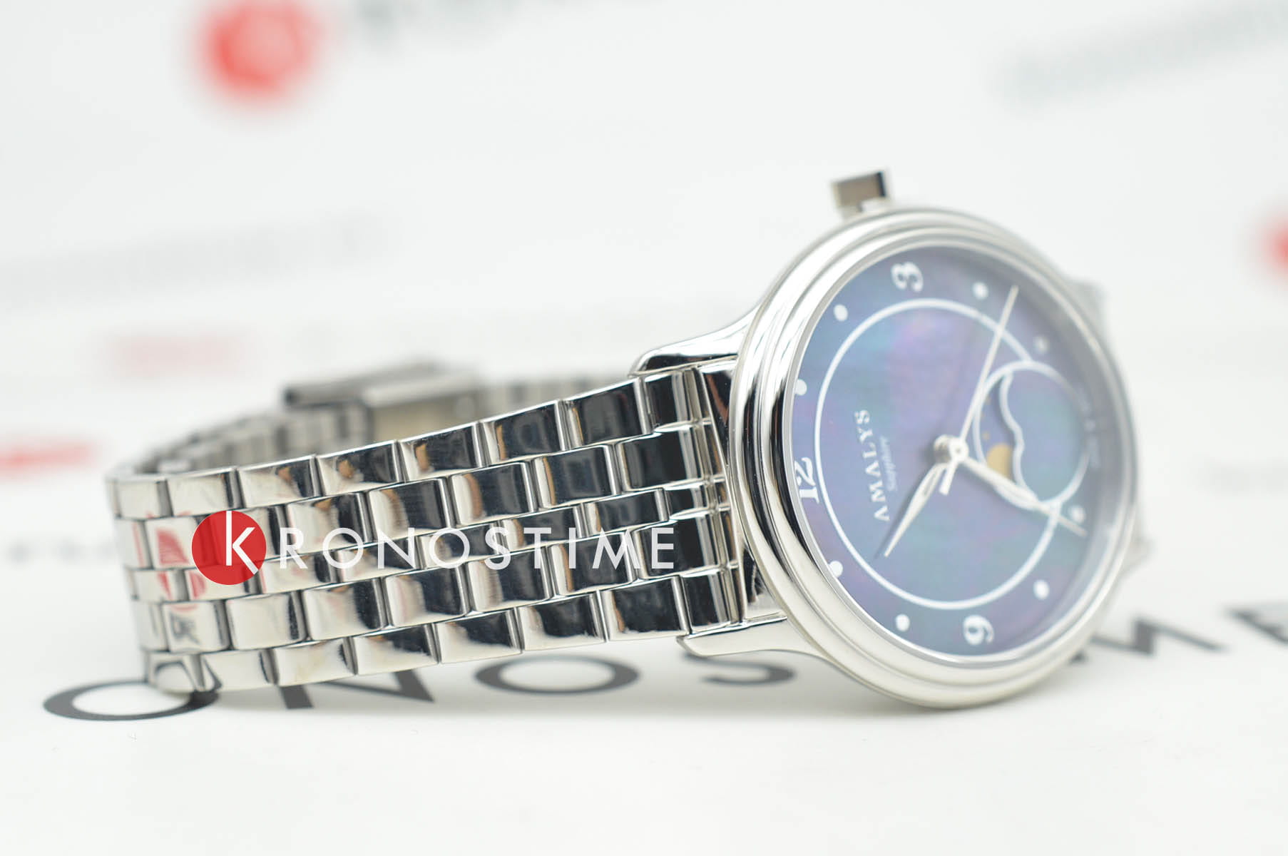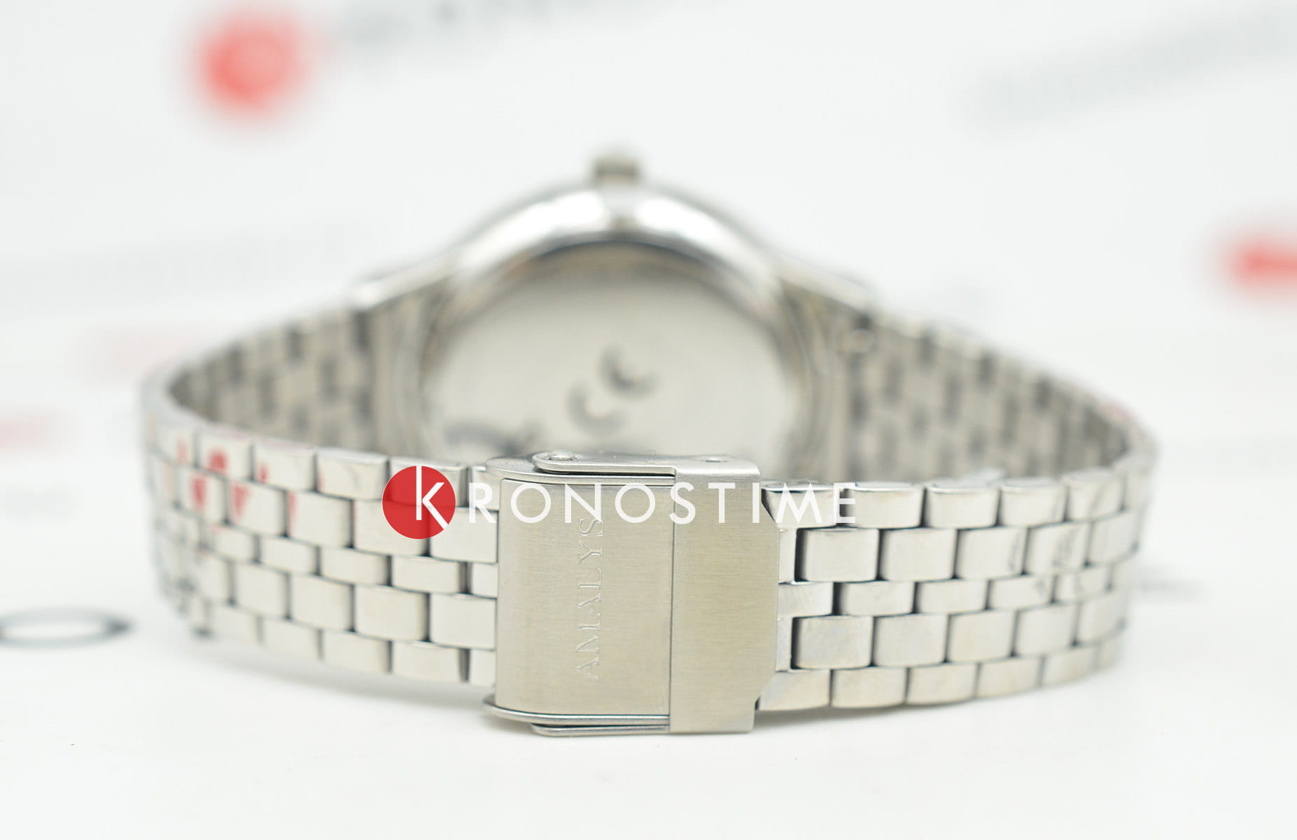 Amalys AMW-203 — женская модель с элегантным классическим стилем и утончёнными деталями. Круглый корпус изготовлен из нержавеющей стали и гармонирует с браслетом в том же исполнении, состоящим из звеньев и обеспечивающим комфортное прилегание к запястью. Защитную функцию выполняет сапфировое стеклоСапфировое стеклоПрочный и надёжный материал из кристалла сапфира синтетического происхождения, характеризующийся особой твёрдостью и устойчивостью к царапинам и повреждениям., которое отличается стойкостью к царапинам и сохраняет высокую прозрачность. В основе лежит кварцевый механизм, гарантирующий точность хода и простоту эксплуатации. Циферблат украшен изящными арабскими цифрами и метками, дополнен утончённым индикатором фаз Луны, который придаёт часам особый шарм и делает их акцентной деталью образа. Водозащита 3 ATM защищает от случайных брызг и дождя. Модель сочетает функциональность и изысканность, подойдёт как для повседневного стиля, так и для особых случаев.