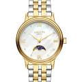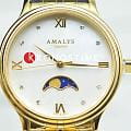 Amalys AMW-205 — женская модель с элегантным классическим стилем и утончёнными деталями. Круглый корпус изготовлен из нержавеющей стали с PVDPVDУльтратонкое покрытие наносится в технике вакуумного напыления, сочетает в себе нитрид титана особой прочности со слоем золота или оксида хрома. Несёт в себе декоративную или защитную функцию.-покрытием золотистого оттенка и гармонирует с браслетом в том же исполнении, состоящим из звеньев и обеспечивающим комфортное прилегание к запястью. Защитную функцию выполняет сапфировое стеклоСапфировое стеклоПрочный и надёжный материал из кристалла сапфира синтетического происхождения, характеризующийся особой твёрдостью и устойчивостью к царапинам и повреждениям., которое отличается стойкостью к царапинам и сохраняет высокую прозрачность. В основе лежит кварцевый механизм, гарантирующий точность хода и простоту эксплуатации. Циферблат украшен изящными римскими цифрами и метками, дополнен утончённым индикатором фаз Луны, который придаёт часам особый шарм и делает их акцентной деталью образа. Водозащита 3 ATM защищает от случайных брызг и дождя. Модель сочетает функциональность и изысканность, подойдёт как для повседневного стиля, так и для особых случаев.