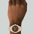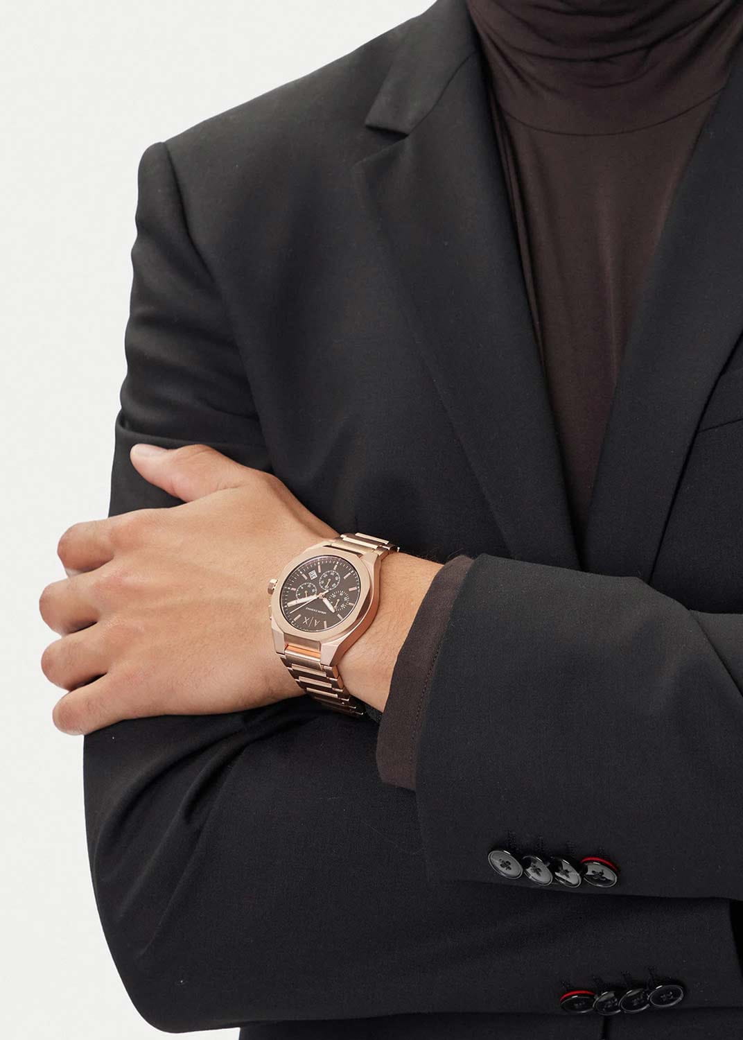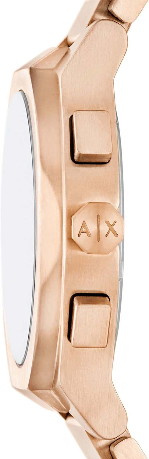 Мужские наручные часы-хронографХронографФункция позволяет измерять отрезки времени с особой точностью: часы, минуты, секунды. Верным признаком хронографа является наличие на циферблате 3 дополнительных окошек-счётчиков. с секундомеромСекундомерСекундоме́р — прибор, способный измерять интервалы времени с точностью до долей секунды. Armani Exchange Rafael AX4188 кварцевый механизм с высокой точностью. Корпус часов изготовлены из нержавеющей стали с IP-покрытиемIP-покрытиеМетод ионного напыления. Демонстрирует повышенную устойчивость к истиранию, окислению и химическим веществам. Под воздействием высокого давления и температуры около 1500°C молекулы металла надёжно соединяются с частицами корпуса часов. цвета розового золота. Минеральное стеклоМинеральное стеклоМинеральное стекло представляет собой искусственно выращенный минерал кварца. Такое стекло отличается особой устойчивостью к повреждениям и царапинам. Уступает по некоторым качествам сапфировому стеклу. защищает их от царапин и повреждений, сохраняя первозданный вид даже при активном использовании. Окошко даты находится в положении между 4 и 5 часов. Стрелки с люминесцентным покрытиемЛюминесцентное покрытиеПозволяет считывать показания времени в темноте. Производители наносят на стрелки, часовые индексы, безель или поверхность циферблата светонакопительный состав, дающий холодное свечение.. 12-ти и 24-х часовой формат времени. Стальной браслет с IP-покрытиемIP-покрытиеМетод ионного напыления. Демонстрирует повышенную устойчивость к истиранию, окислению и химическим веществам. Под воздействием высокого давления и температуры около 1500°C молекулы металла надёжно соединяются с частицами корпуса часов. на раскладной застёжкеРаскладная застёжкаТакой тип застёжки используется только на браслетах из металла. Она никогда не раскрывается полностью, происходит разделение на 2 и более частей. Раскладывающая застёжка снизит вероятность потери часов к минимуму. обеспечивает надежную фиксацию на запястье. Класс водозащиты: 50 метров позволит защитить корпус от случайных брызг или капель дождя. Эта модель – отличный выбор для тех, кто ищет сочетание стиля, качества и функциональности. Часы станут не только полезным аксессуаром, но и выразительным элементом вашего имиджа.