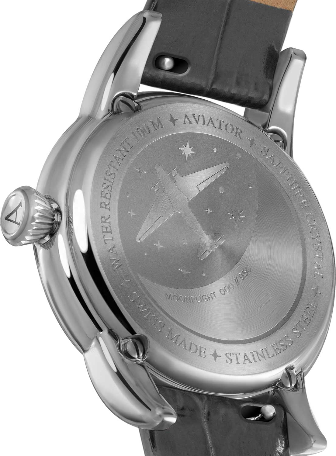 Aviator V.1.33.0.254.4 “Douglas Moonflight” — элегантный дамский швейцарский Moonphase с утончённой авиационной эстетикой. Корпус 36 мм из нержавеющей стали с полированной отделкой обладает компактными пропорциями и удобным литым профилем.