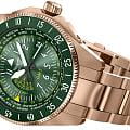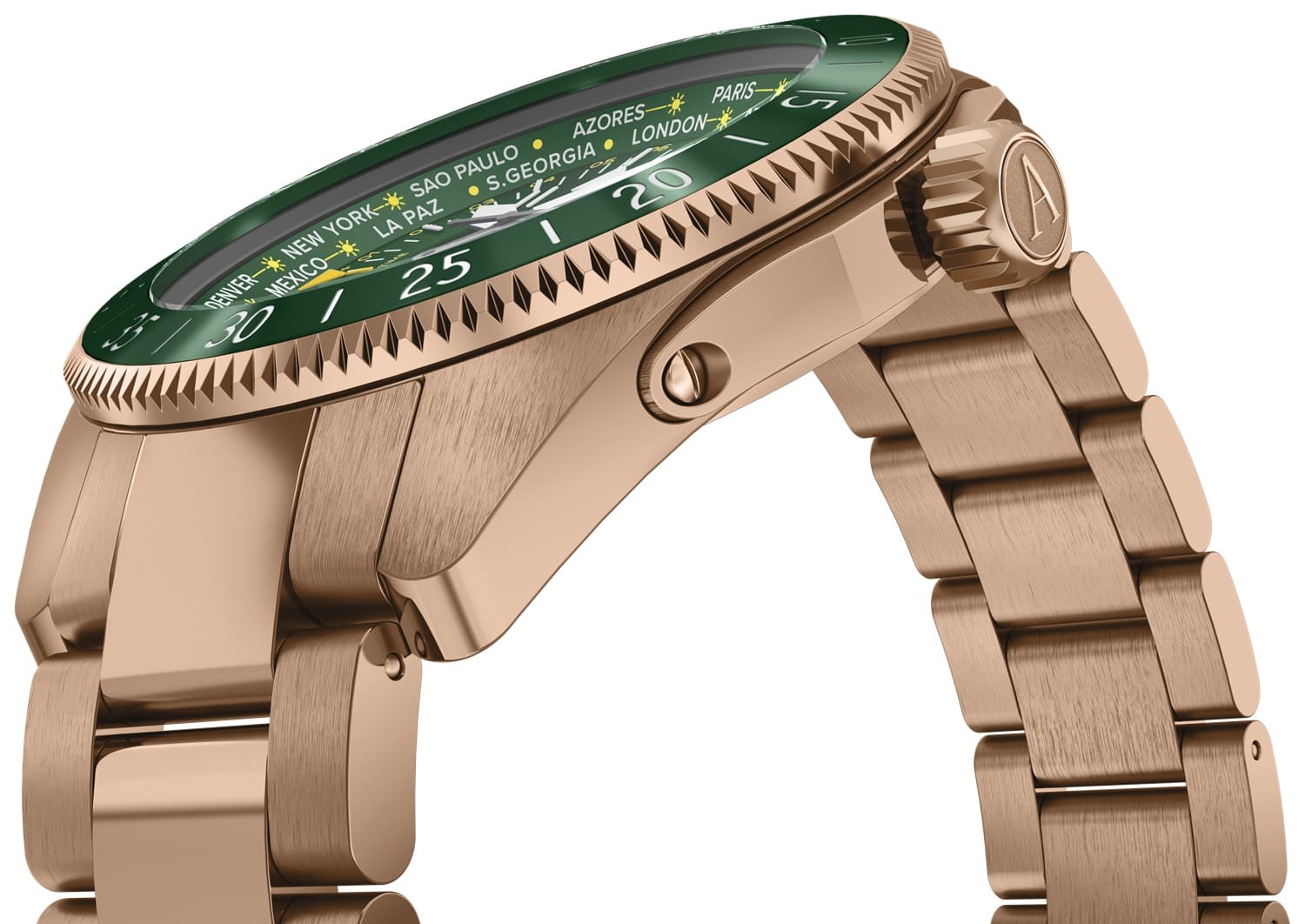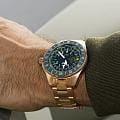 Циферблат отличается детальной функциональностью: в центре — крупные арабские цифры и стрелки, покрытые люминесцентным покрытиемЛюминесцентное покрытиеПозволяет считывать показания времени в темноте. Производители наносят на стрелки, часовые индексы, безель или поверхность циферблата светонакопительный состав, дающий холодное свечение., обеспечивающими мгновенное считывание времени даже в темноте. На «3 часах» — окошко даты, а индикатор второго часового пояса (GMT) удобно расположен на «9 часах». С внешней стороны — вращающийся безельБезельВнешний ободок, закрепляющий стекло. В спортивных часах так называется поворотное кольцо с делениями на циферблате, выполняет роль таймера – замеряет отрезки времени на шкале. Неподвижный безель – элемент декора. Однонаправленно вращающийся безель на дайверских часах позволяет фиксировать моменты погружения и выныривания на поверхность. с PVD-покрытиемPVDУльтратонкое покрытие наносится в технике вакуумного напыления, сочетает в себе нитрид титана особой прочности со слоем золота или оксида хрома. Несёт в себе декоративную или защитную функцию. с насечкой и градусной шкалой для секунд — идеален для расчёта времени пути или времени прибытия  .