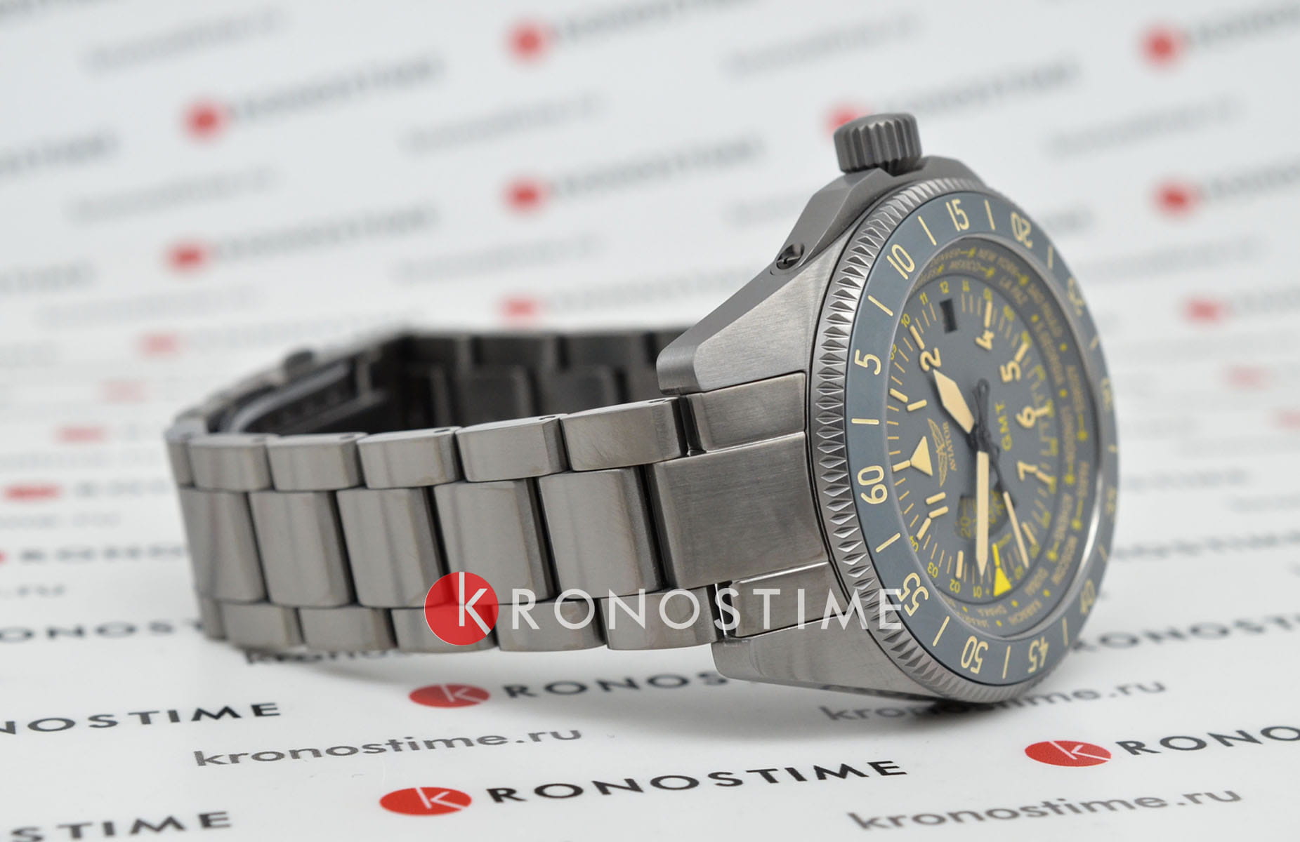 Циферблат отличается детальной функциональностью: в центре — крупные арабские цифры и стрелки, покрытые люминесцентным покрытиемЛюминесцентное покрытиеПозволяет считывать показания времени в темноте. Производители наносят на стрелки, часовые индексы, безель или поверхность циферблата светонакопительный состав, дающий холодное свечение., обеспечивающими мгновенное считывание времени даже в темноте. На «3 часах» — окошко даты, а индикатор второго часового пояса (GMT) удобно расположен на «9 часах». С внешней стороны — вращающийся безельБезельВнешний ободок, закрепляющий стекло. В спортивных часах так называется поворотное кольцо с делениями на циферблате, выполняет роль таймера – замеряет отрезки времени на шкале. Неподвижный безель – элемент декора. Однонаправленно вращающийся безель на дайверских часах позволяет фиксировать моменты погружения и выныривания на поверхность. с PVD-покрытиемPVDУльтратонкое покрытие наносится в технике вакуумного напыления, сочетает в себе нитрид титана особой прочности со слоем золота или оксида хрома. Несёт в себе декоративную или защитную функцию. с насечкой и градусной шкалой для секунд — идеален для расчёта времени пути или времени прибытия  .