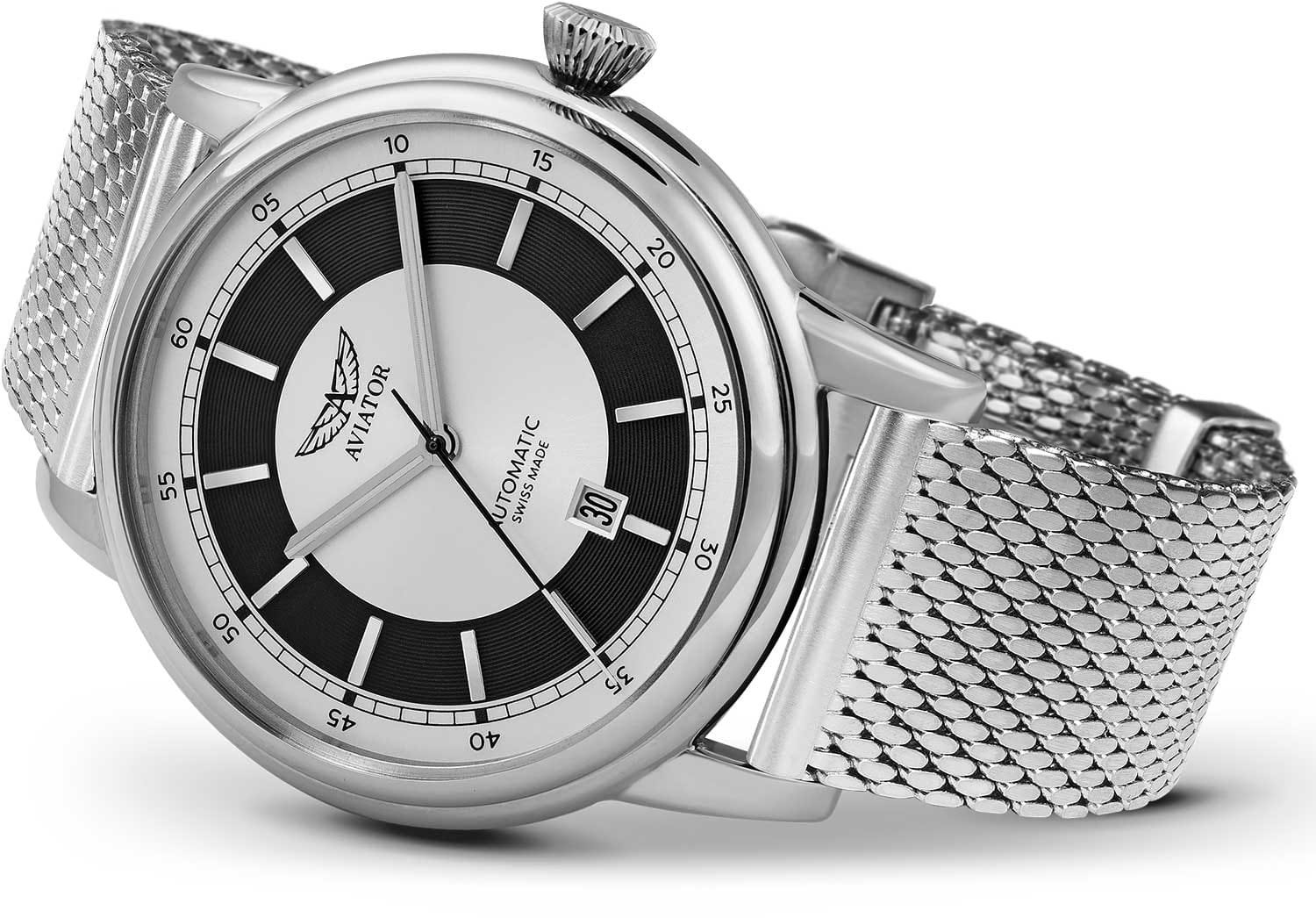 Aviator Douglas DC-3 V.3.32.0.247.5 — швейцарские часы в классике авиадизайна, сочетающие безупречную читаемость и высокую надёжность. Лимитированная серия. Корпус диаметром 45 мм выполнен из нержавеющей стали 316L. Накладные метки выполнены в виде штрихов. Окошко даты находится в положении 6 часов. Часовые метки и стрелки покрыты люминесцентным покрытиемЛюминесцентное покрытиеПозволяет считывать показания времени в темноте. Производители наносят на стрелки, часовые индексы, безель или поверхность циферблата светонакопительный состав, дающий холодное свечение. Superluminova, позволяющим легко определять время даже в тёмное время суток. Поверхность защищена прочным сапфировым стекломСапфировое стеклоПрочный и надёжный материал из кристалла сапфира синтетического происхождения, характеризующийся особой твёрдостью и устойчивостью к царапинам и повреждениям. с антибликовым покрытиемАнтибликовое покрытиеСлой оксида металла в 0,13-0,3 микрон, благодаря которому стекло часов не бликует и не отражает свет. Антибликовое покрытие уменьшает отражение света в 10 раз, обеспечивая отличную читаемость показателей циферблата., устойчивым к царапинам. Сердце модели — швейцарский механизм Sellita SW 200-1, известный своей точностью и долговечностью. Водозащита 100 метров, позволит плавать, нырять и заниматься другими водными видами спорта. Завинчивающаяся головка и задняя крышка обеспечивают уверенную ударопрочностьУдаропрочный корпусМеханизм заключён в корпус, выполненный из современных материалов, устойчивых к ударам, механическим повреждениям и падению с высоты: инновационный пластик, карбон, нержавеющая сталь, титан. и надёжную защиту от влаги и пыли. В механизме 26 камней, запас хода 38 часов. Модель дополнена стальным браслетом миланского плетения, закреплённым с помощью раскладной застёжкиРаскладная застёжкаТакой тип застёжки используется только на браслетах из металла. Она никогда не раскрывается полностью, происходит разделение на 2 и более частей. Раскладывающая застёжка снизит вероятность потери часов к минимуму.