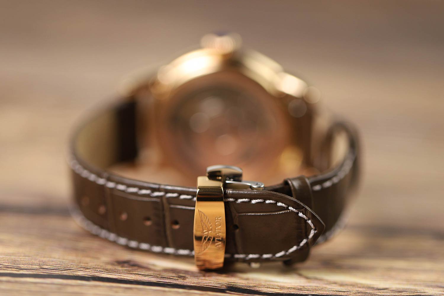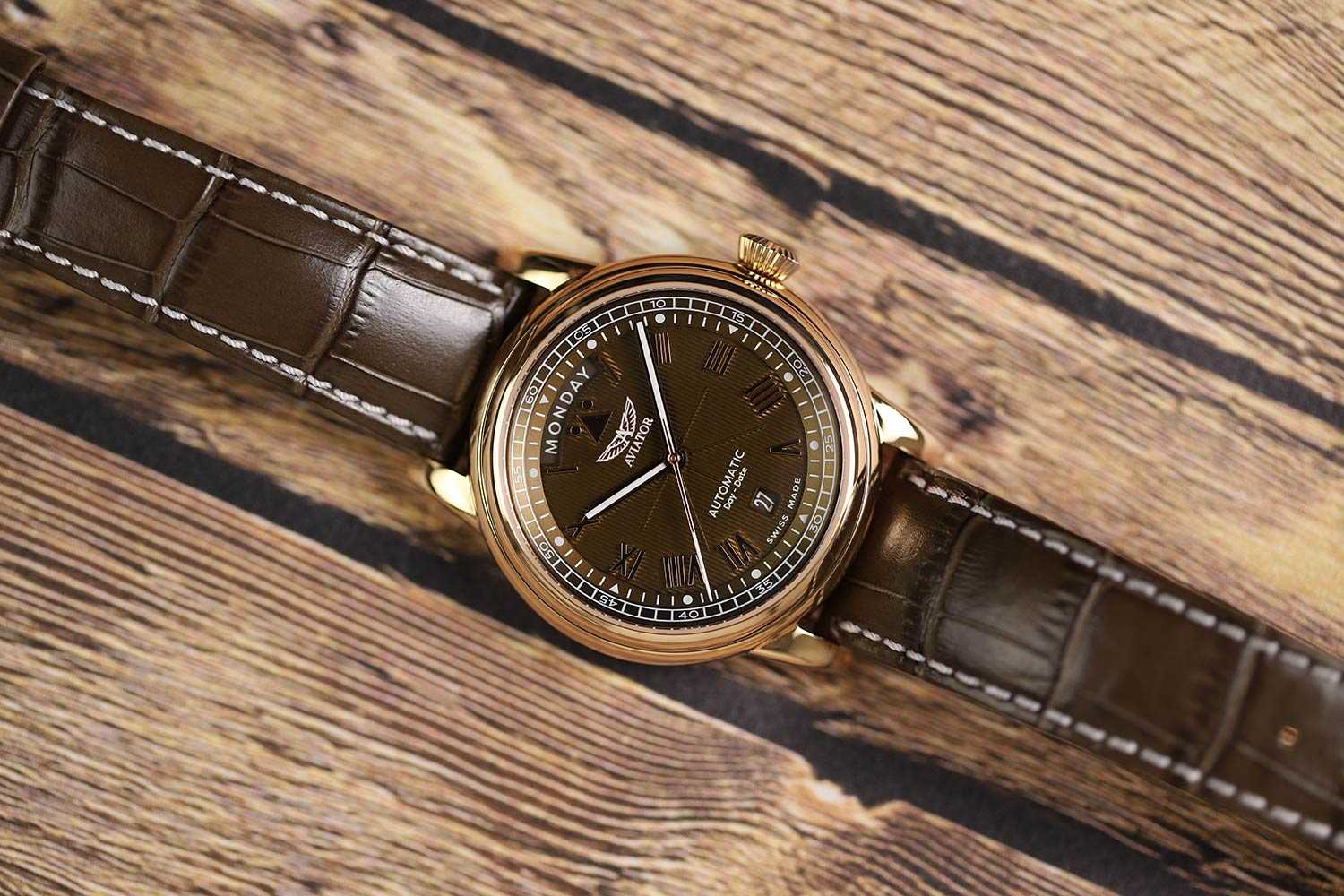 Aviator Douglas Day Date V.3.35.2.280.4 — швейцарские часы в классике авиадизайна, сочетающие безупречную читаемость и высокую надёжность. Лимитированная серия. Корпус диаметром 41,2 мм выполнен из нержавеющей стали 316L с PVD-покрытиемPVDУльтратонкое покрытие наносится в технике вакуумного напыления, сочетает в себе нитрид титана особой прочности со слоем золота или оксида хрома. Несёт в себе декоративную или защитную функцию. цвета розового золота. Накладные метки выполнены в виде римских цифр. Окошко даты находится в положении 6 часов. День недели находится в положении 12 часов. Часовые метки и стрелки покрыты люминесцентным покрытиемЛюминесцентное покрытиеПозволяет считывать показания времени в темноте. Производители наносят на стрелки, часовые индексы, безель или поверхность циферблата светонакопительный состав, дающий холодное свечение. Superluminova, позволяющим легко определять время даже в тёмное время суток. Поверхность защищена прочным сапфировым стекломСапфировое стеклоПрочный и надёжный материал из кристалла сапфира синтетического происхождения, характеризующийся особой твёрдостью и устойчивостью к царапинам и повреждениям. с антибликовым покрытием, устойчивым к царапинам. Сердце модели — швейцарский механизм Sellita SW 240-2, известный своей точностью и долговечностью. Водозащита 100 метров, позволит плавать, нырять и заниматься другими водными видами спорта. Завинчивающаяся головка и задняя крышка обеспечивают уверенную ударопрочностьУдаропрочный корпусМеханизм заключён в корпус, выполненный из современных материалов, устойчивых к ударам, механическим повреждениям и падению с высоты: инновационный пластик, карбон, нержавеющая сталь, титан. и надёжную защиту от влаги и пыли. В механизме 26 камней, запас хода до 41 час. Модель дополнена кожаным ремешком с выразительной текстурой и классическим стилем, закреплённым с помощью застёжке-бабочке с кнопкамиЗастёжка "бабочка"Такой вид застёжки дополняется предохранителями, помогающими избежать случайного раскрытия браслета. Обладают изящным исполнением. — для максимального комфорта и лёгкости в повседневном использовании. Модель вдохновлена американским пассажирским самолетом Douglas DC-3, который является одним из лучших самолетов за всю историю авиации. Aviator — это образец лётной точности, инженерной чёткости и сдержанной роскоши, идеально подходящий для тех, кто ценит функциональность и уверенность в каждом элементе.
