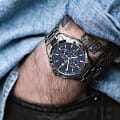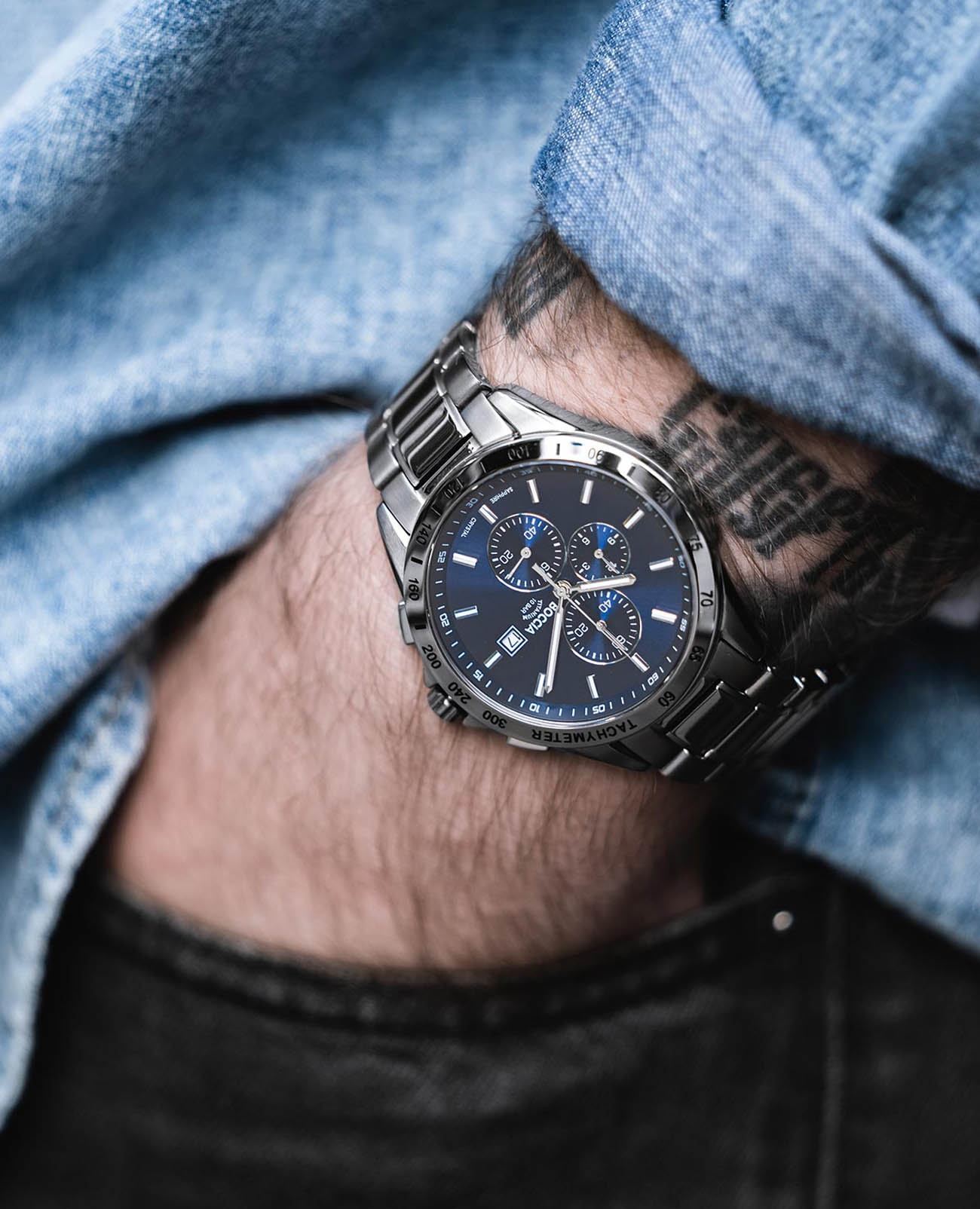 Мужские немецкие титановые часы-хронографХронографФункция позволяет измерять отрезки времени с особой точностью: часы, минуты, секунды. Верным признаком хронографа является наличие на циферблате 3 дополнительных окошек-счётчиков. с секундомеромСекундомерСекундоме́р — прибор, способный измерять интервалы времени с точностью до долей секунды. Boccia Titanium Circle-Oval 3751-01, кварцевый механизм с высокой точностью. Минеральное стеклоМинеральное стеклоМинеральное стекло представляет собой искусственно выращенный минерал кварца. Такое стекло отличается особой устойчивостью к повреждениям и царапинам. Уступает по некоторым качествам сапфировому стеклу. устойчивое к появлению царапин, обладающее высокой прозрачностью. Корпус изготовлен из титана. БезельБезельВнешний ободок, закрепляющий стекло. В спортивных часах так называется поворотное кольцо с делениями на циферблате, выполняет роль таймера – замеряет отрезки времени на шкале. Неподвижный безель – элемент декора. Однонаправленно вращающийся безель на дайверских часах позволяет фиксировать моменты погружения и выныривания на поверхность. из титана со шкалой тахиметрТахиметрРазмеченная шкала, располагается на ободке или безеле часов. Тахиметр позволяет рассчитать скорость на определённом участке пути, расстояние измеряется в километрах или милях.. На цифрблате расположены три дополнительных индикатора и окошко даты. Стрелки с люминесцентным покрытиемЛюминесцентное покрытиеПозволяет считывать показания времени в темноте. Производители наносят на стрелки, часовые индексы, безель или поверхность циферблата светонакопительный состав, дающий холодное свечение.. Класс водозащиты: 100 метров, позволит плавать, нырять и заниматься другими водными видами спорта. Браслет из титана на раскладной застёжкеРаскладная застёжкаТакой тип застёжки используется только на браслетах из металла. Она никогда не раскрывается полностью, происходит разделение на 2 и более частей. Раскладывающая застёжка снизит вероятность потери часов к минимуму..