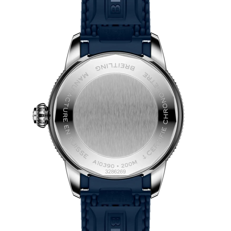 Мужские механические часы Breitling Superocean Heritage A10390161C1S1 — это современный аксессуар, вдохновлённый классикой дайвинговых часов. Модель выполнена в круглой форме из нержавеющей стали с диаметром корпуса 36 мм и толщиной 12,5 мм, что делает её прочной и устойчивой к царапинам. Циферблат синего цвета дополнен индексами, а его поверхность защищена сапфировым стекломСапфировое стеклоПрочный и надёжный материал из кристалла сапфира синтетического происхождения, характеризующийся особой твёрдостью и устойчивостью к царапинам и повреждениям., устойчивым к повреждениям. Стрелки и метки имеют люминесцентное покрытие, обеспечивающее отличную читаемость даже в условиях слабого освещения. Браслет из синего каучука оснащён раскладной застёжкойРаскладная застёжкаТакой тип застёжки используется только на браслетах из металла. Она никогда не раскрывается полностью, происходит разделение на 2 и более частей. Раскладывающая застёжка снизит вероятность потери часов к минимуму. с фиксатором, обеспечивающей комфорт и надёжную фиксацию на запястье. Часы оснащены автоматическим механизмом Breitling Calibre 10, обеспечивающим запас хода до 42 часов. Функции включают отображение времени (часы, минуты, секунды) и даты в положении 6 часов. Водонепроницаемость позволяет использовать модель при плавании и других водных активностях без глубокого погружения. Эти часы станут универсальным аксессуаром для тех, кто ценит сочетание стиля, функциональности и надёжности — идеальный выбор для повседневной носки и активного образа жизни.