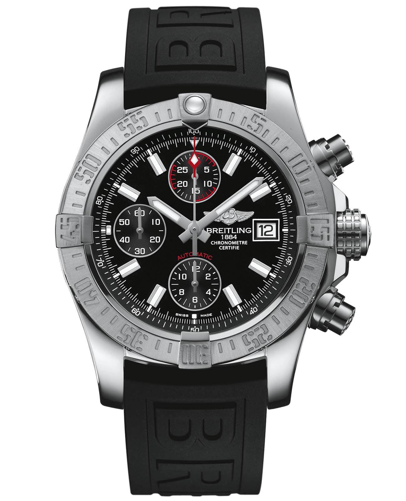 Хронограф Avenger II – воплощение силы и решимости. Прекрасно различимые цифры в трафаретном начертании и часовые маркеры – отличительная особенность этих часов. Стальной корпус с водонепроницаемостью 300 м (1000 футов) оснащен завинчивающимися кнопками с накладками. Внутри него находится механизм хронографа с автоподзаводом, прошедший, как и все калибры Breitling, официальную сертификацию. На заднюю крышку из титана нанесена шкала конвертации единиц измерения английской системы мер в метрические. Образец надежных и функциональных часов с превосходной эргономикой.