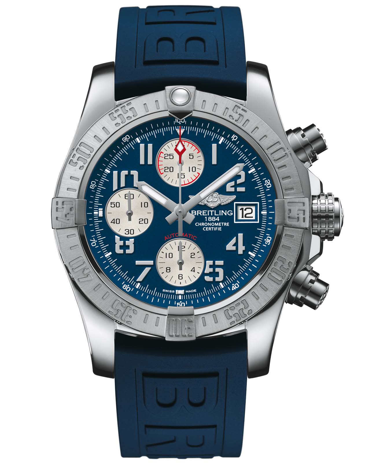Хронограф Avenger II – воплощение силы и решимости. Прекрасно различимые цифры в трафаретном начертании и часовые маркеры – отличительная особенность этих часов. Стальной корпус с водонепроницаемостью 300 м (1000 футов) оснащен завинчивающимися кнопками с накладками. Внутри него находится механизм хронографа с автоподзаводом, прошедший, как и все калибры Breitling, официальную сертификацию. На заднюю крышку из титана нанесена шкала конвертации единиц измерения английской системы мер в метрические. Образец надежных и функциональных часов с превосходной эргономикой.