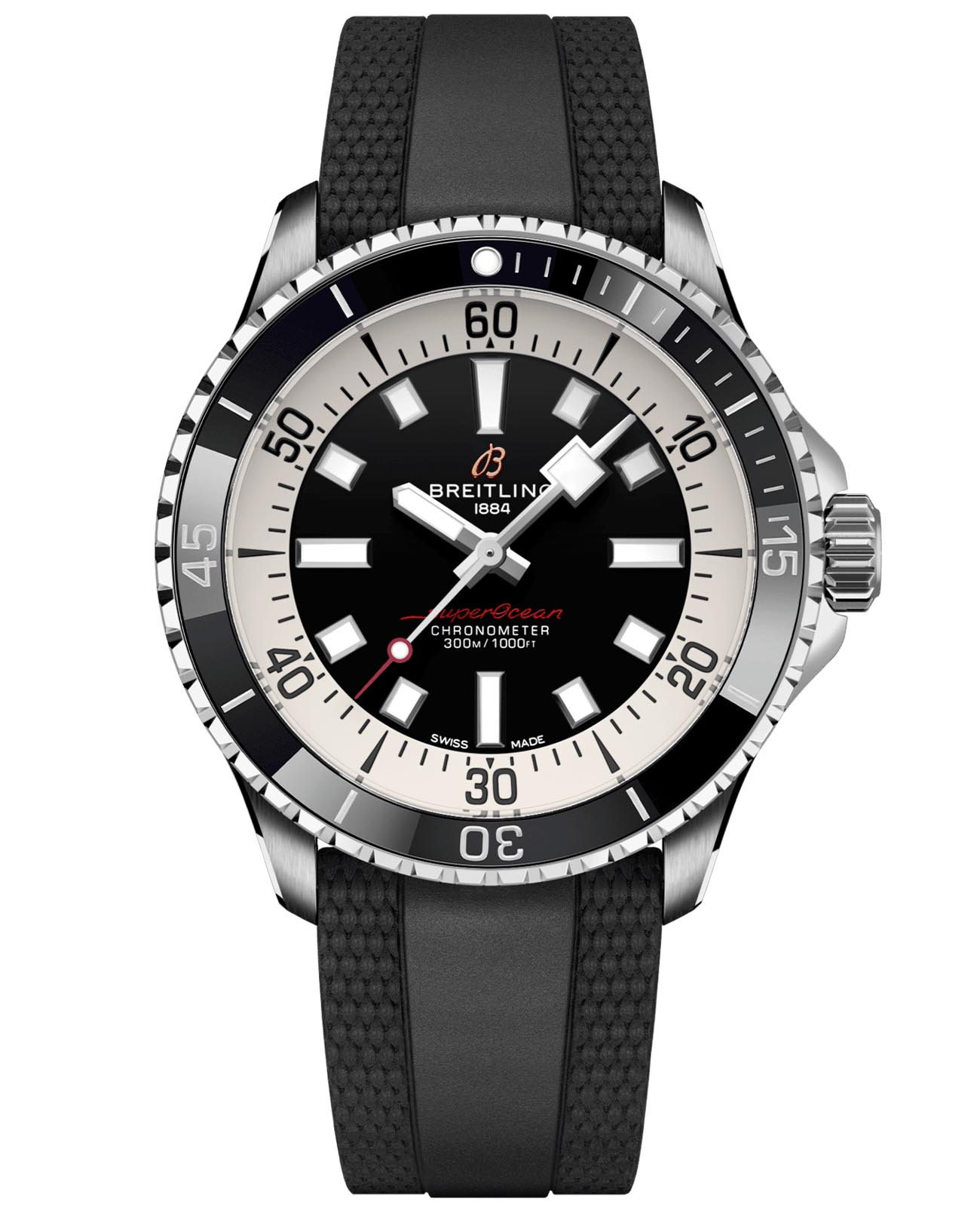 Мужские водонепроницаемые швейцарские часы Breitling Superocean Automatic 42 A17375211B1S1, механический механизм (автоматический калибр) с высокой точностью. Сапфировое стеклоСапфировое стеклоПрочный и надёжный материал из кристалла сапфира синтетического происхождения, характеризующийся особой твёрдостью и устойчивостью к царапинам и повреждениям. устойчивое к появлению царапин, обладающее высокой прозрачностью. Класс водозащиты: 300 метров, позволит плавать, нырять и заниматься другими водными видами спорта. Корпус часов изготовлен из стали. Силиконовый ремешок с раскладной застёжкойРаскладная застёжкаТакой тип застёжки используется только на браслетах из металла. Она никогда не раскрывается полностью, происходит разделение на 2 и более частей. Раскладывающая застёжка снизит вероятность потери часов к минимуму.. Стрелки и метки с люминесцентным покрытиемЛюминесцентное покрытиеПозволяет считывать показания времени в темноте. Производители наносят на стрелки, часовые индексы, безель или поверхность циферблата светонакопительный состав, дающий холодное свечение.. Широкие стрелки и индексы с люминесцентным покрытиемЛюминесцентное покрытиеПозволяет считывать показания времени в темноте. Производители наносят на стрелки, часовые индексы, безель или поверхность циферблата светонакопительный состав, дающий холодное свечение. обеспечивают легкую читаемость под водой. Вращающийся стальной безельБезельВнешний ободок, закрепляющий стекло. В спортивных часах так называется поворотное кольцо с делениями на циферблате, выполняет роль таймера – замеряет отрезки времени на шкале. Неподвижный безель – элемент декора. Однонаправленно вращающийся безель на дайверских часах позволяет фиксировать моменты погружения и выныривания на поверхность. с люминесцентным покрытиемЛюминесцентное покрытиеПозволяет считывать показания времени в темноте. Производители наносят на стрелки, часовые индексы, безель или поверхность циферблата светонакопительный состав, дающий холодное свечение. Superluminova из нержавеющей стали и керамики, защищенный от царапин, никогда не изнашивается и не выцветает.