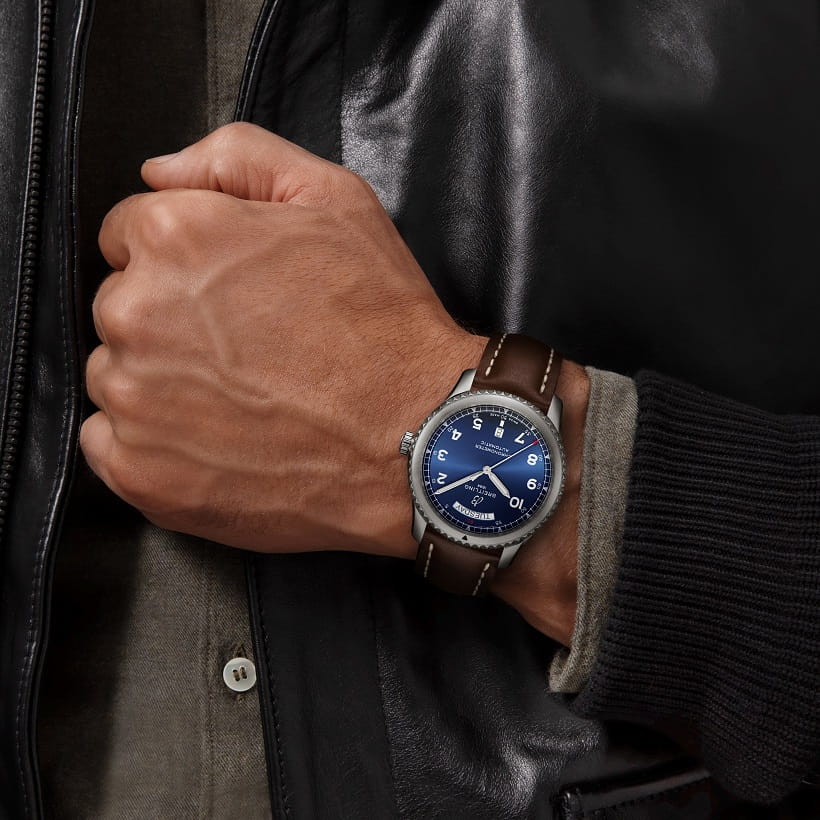 Модель Aviator 8 Automatic Day & Date 41 A45330101C1X2 отображает день недели, дату и время. Индикатор дня недели размещен в положении «12 часов» симметрично дате, в положении «6 часов». «Сердцем» модели этих автоматических наручных часов является калибр Breitling Caliber 45, а двунаправленный ротор автоподзавода обеспечивает запас хода свыше 40 часов.