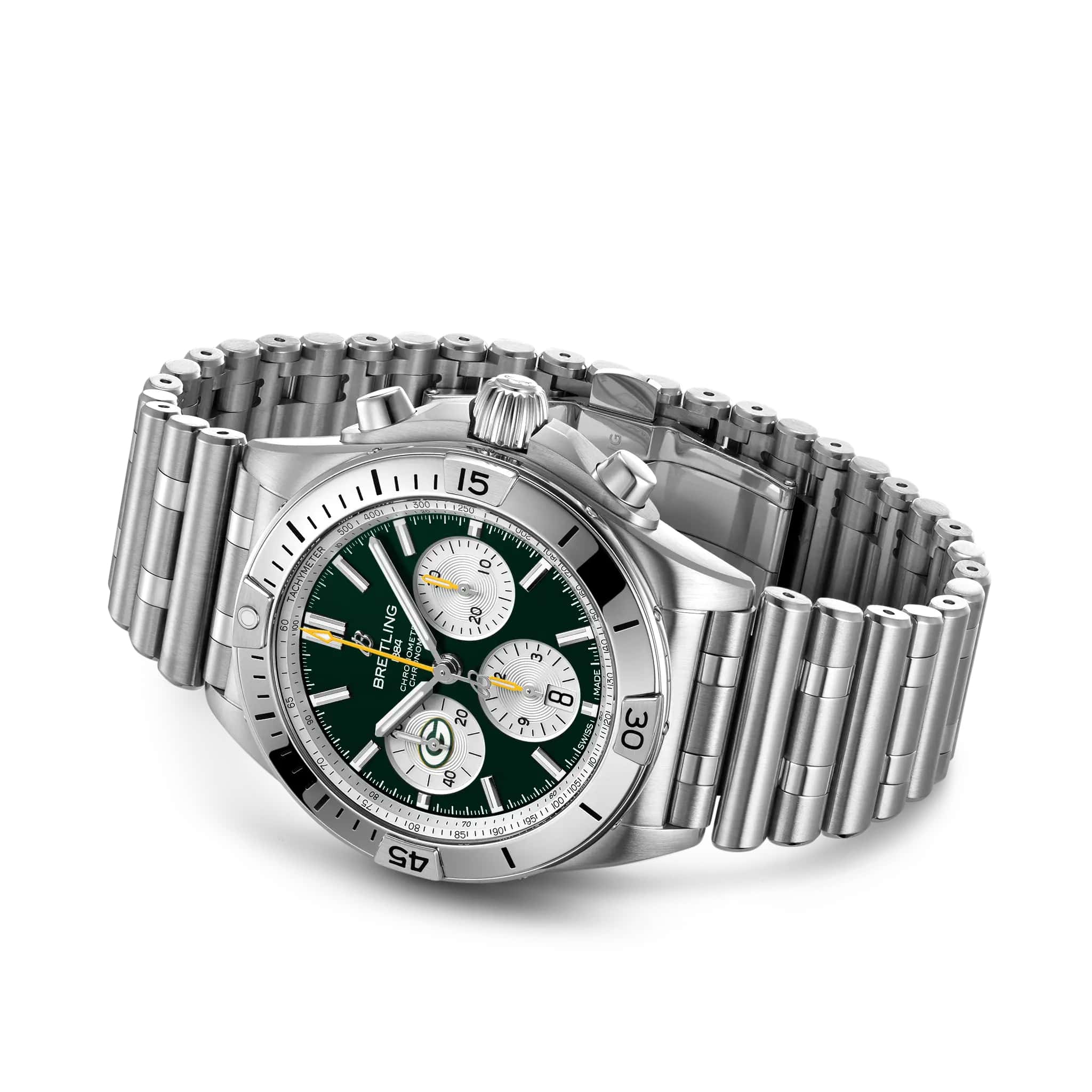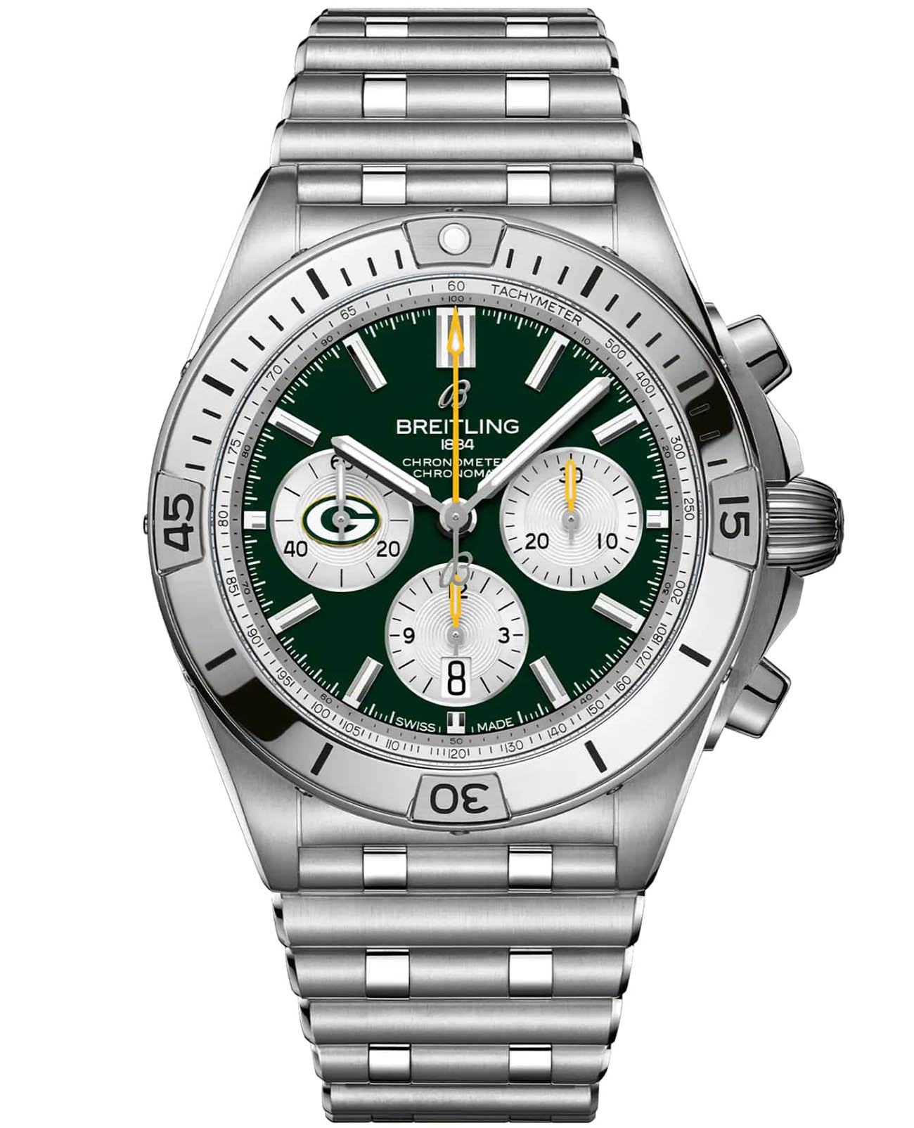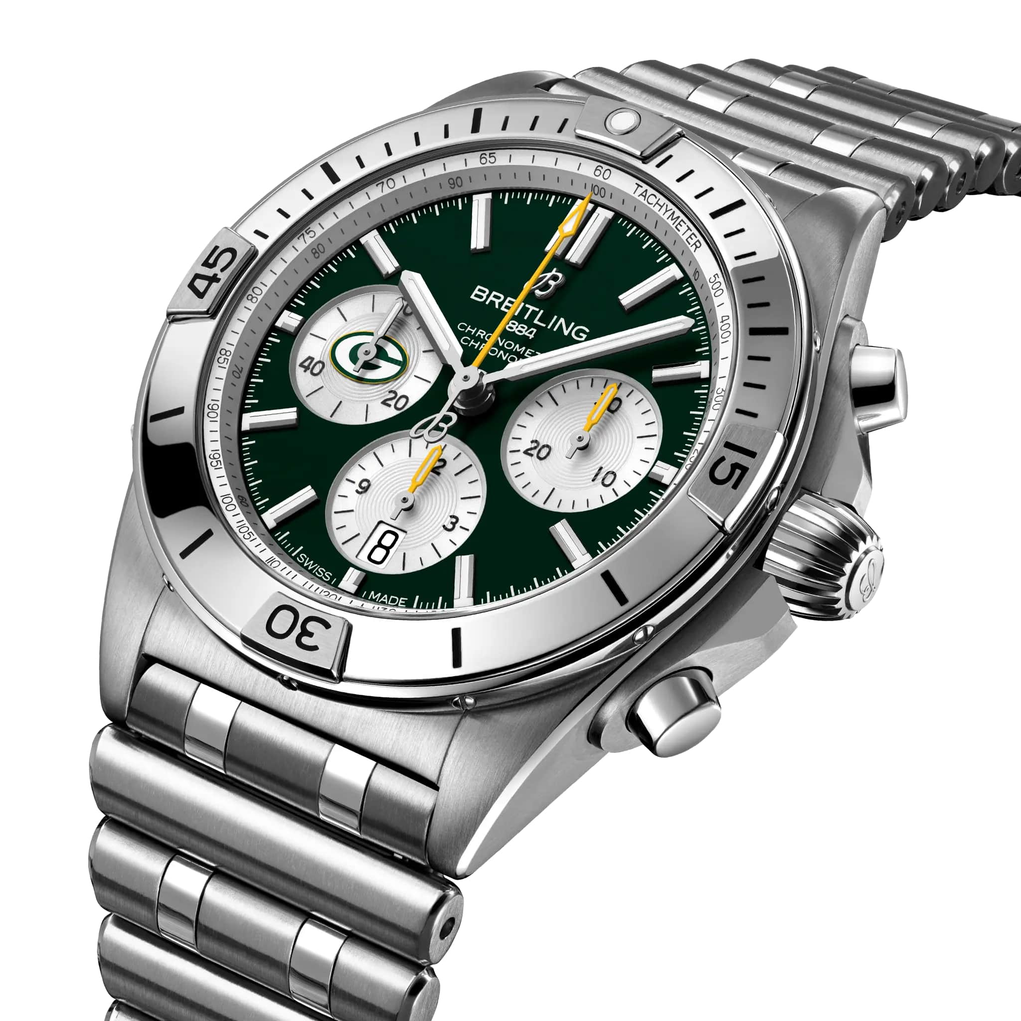 Мужские швейцарские часы-хронограф с секундомером Breitling Chronomat B01 42 NFL Green Bay Packers Edition AB01342B1L1A1, механический механизм (автоматический калибр) с высокой точностью. Сапфировое стеклоСапфировое стеклоПрочный и надёжный материал из кристалла сапфира синтетического происхождения, характеризующийся особой твёрдостью и устойчивостью к царапинам и повреждениям. устойчивое к появлению царапин, обладающее высокой прозрачностью. Класс водозащиты: 200 метров, позволит плавать, нырять и заниматься другими водными видами спорта. Корпус часов изготовлен из нержавеющей стали. Стальной браслет на застёжке «бабочка» с кнопкамиЗастёжка "бабочка"Такой вид застёжки дополняется предохранителями, помогающими избежать случайного раскрытия браслета. Обладают изящным исполнением. . Стрелки и метки с люминесцентным покрытиемЛюминесцентное покрытиеПозволяет считывать показания времени в темноте. Производители наносят на стрелки, часовые индексы, безель или поверхность циферблата светонакопительный состав, дающий холодное свечение.. Шкала тахиметра на циферблате. Окошко даты находится в положении 6 часов.