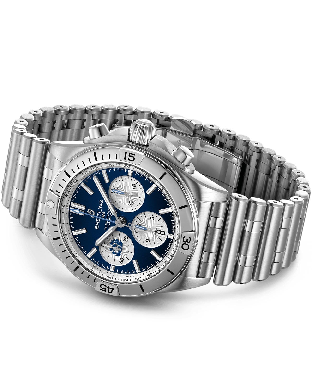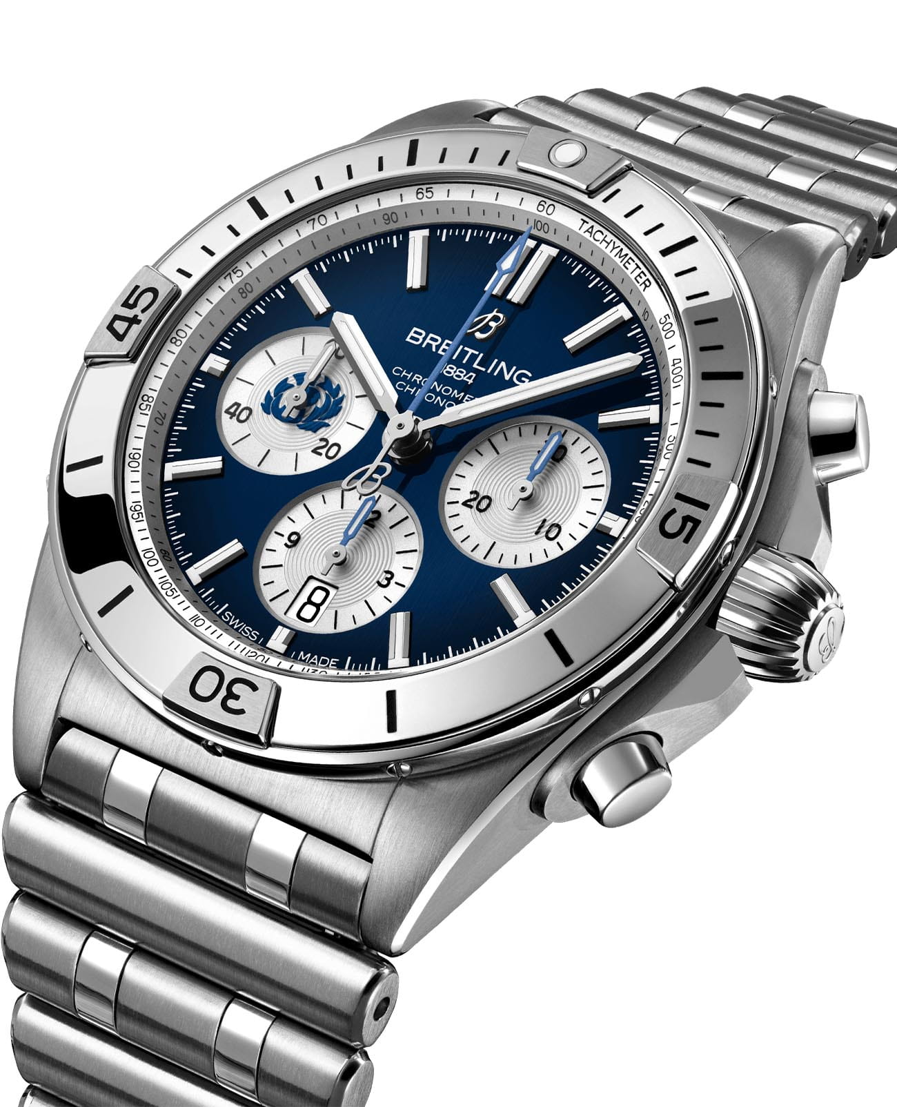 Лимитированные мужские швейцарские часы-хронографХронографФункция позволяет измерять отрезки времени с особой точностью: часы, минуты, секунды. Верным признаком хронографа является наличие на циферблате 3 дополнительных окошек-счётчиков. с секундомеромСекундомерСекундоме́р — прибор, способный измерять интервалы времени с точностью до долей секунды. Breitling Chronomat B01 42 AB0134A51C1A1, механический механизм (автоматический калибр) с высокой точностью. Основанный на хронографе Frecce Tricolori, который был разработан и выпущен в 1983 году в сотрудничестве со знаменитой итальянской авиационной эскадрильей, Chronomat стильно отпраздновал столетие Breitling и ознаменовал возвращение механическому хронографу его законного места в бренде, который построил свою мировую репутацию на этих невероятных часах. Сапфировое стеклоСапфировое стеклоПрочный и надёжный материал из кристалла сапфира синтетического происхождения, характеризующийся особой твёрдостью и устойчивостью к царапинам и повреждениям. устойчивое к появлению царапин, обладающее высокой прозрачностью. Класс водозащиты: 200 метров, позволит плавать, нырять и заниматься другими водными видами спорта. Корпус и браслет часов изготовлены из нержавеющей стали. Часы имеют сертификат COSCСертификат COSCОфициальный сертификат, подтверждающий то, что часы ходят с особо высокой точностью. Для получения документа часы подвергаются тестовым испытаниям, разработанным швейцарским институтом тестирования хронометров COSC. Допустимая норма для механических часов -4/+6 секунд в день, для кварцевых моделей +/- 0,07 секунд в день.. Стрелки и метки с люминесцентным покрытиемЛюминесцентное покрытиеПозволяет считывать показания времени в темноте. Производители наносят на стрелки, часовые индексы, безель или поверхность циферблата светонакопительный состав, дающий холодное свечение.. Шкала тахиметраТахиметрРазмеченная шкала, располагается на ободке или безеле часов. Тахиметр позволяет рассчитать скорость на определённом участке пути, расстояние измеряется в километрах или милях. на циферблате. Окошко даты находится в положении 6 часов. Браслет с застёжкой-бабочкой с кнопкамиЗастёжка "бабочка"Такой вид застёжки дополняется предохранителями, помогающими избежать случайного раскрытия браслета. Обладают изящным исполнением. .