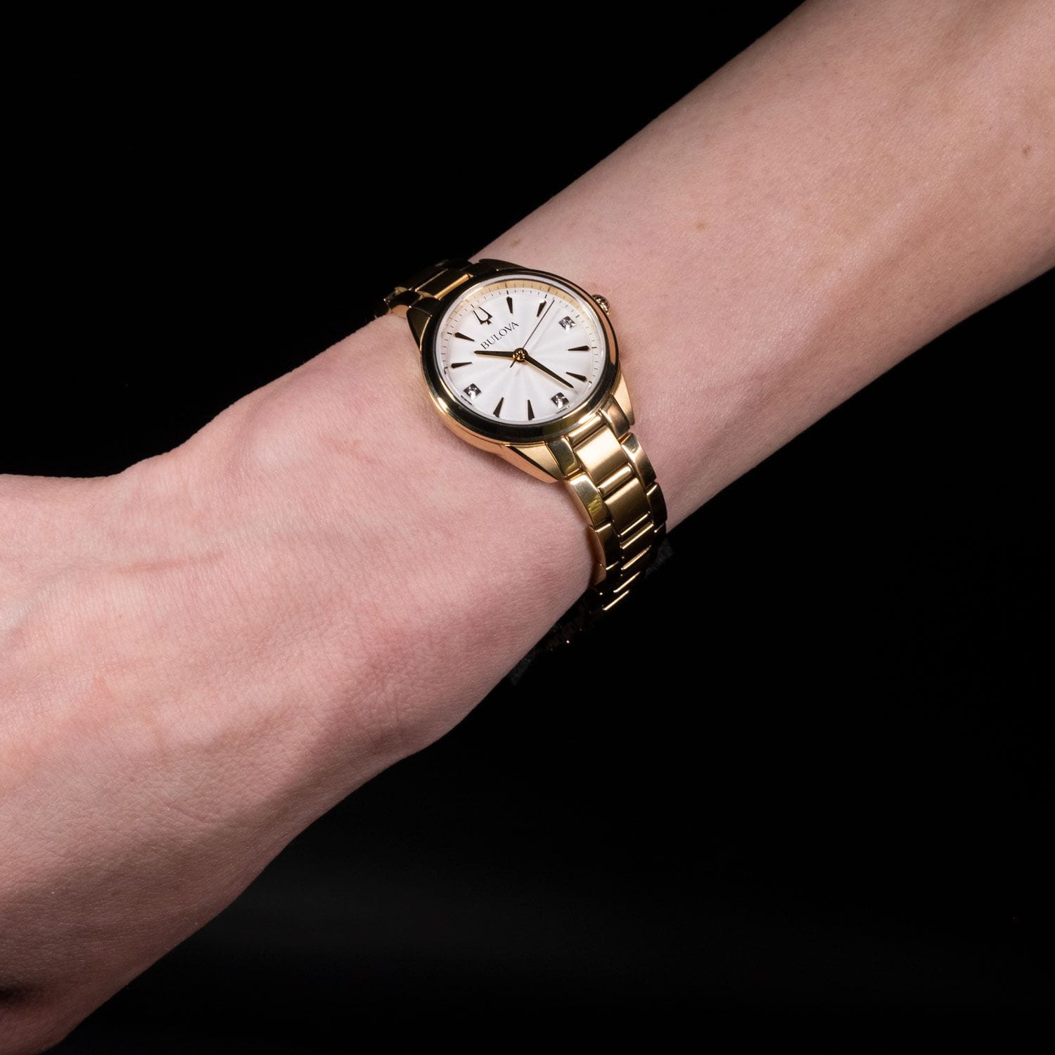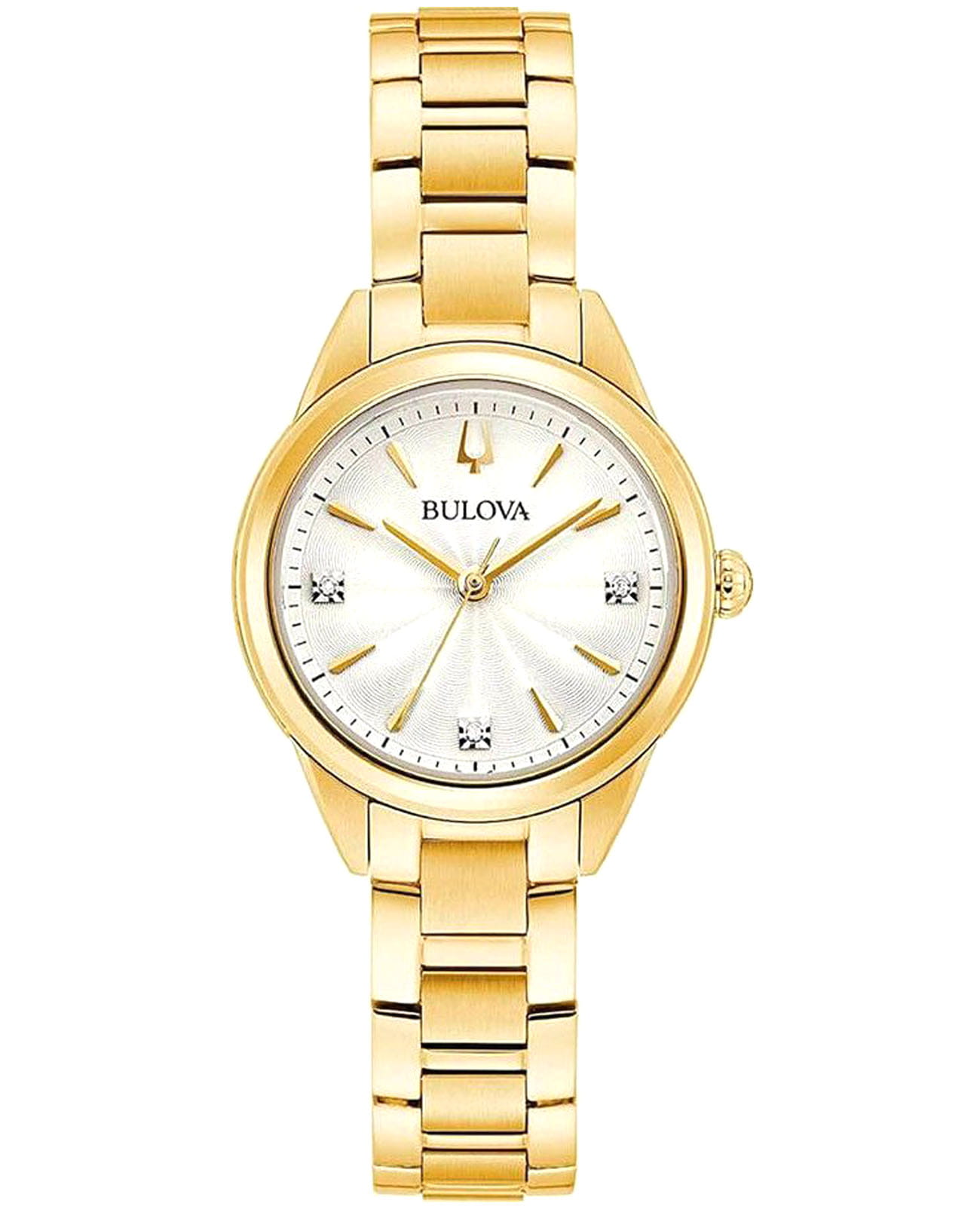 Женские кварцевые часы Bulova Sutton 97P150 – отражающий идеальное сочетание современного дизайна, надёжности и функциональности. Элегантный облик станет превосходным завершением образа, наделив его индивидуальным характером. Корпус из нержавеющей стали с PVD-покрытиемPVDУльтратонкое покрытие наносится в технике вакуумного напыления, сочетает в себе нитрид титана особой прочности со слоем золота или оксида хрома. Несёт в себе декоративную или защитную функцию. золотистого цвета, диаметром 28 мм идеально сбалансирован и элегантен. Минеральное стеклоМинеральное стеклоМинеральное стекло представляет собой искусственно выращенный минерал кварца. Такое стекло отличается особой устойчивостью к повреждениям и царапинам. Уступает по некоторым качествам сапфировому стеклу. защищает циферблат от царапин и устойчивое к мелким механическим повреждениям. Серебристый циферблат украшен бриллиантами. Стальной браслет с PVD-покрытиемPVDУльтратонкое покрытие наносится в технике вакуумного напыления, сочетает в себе нитрид титана особой прочности со слоем золота или оксида хрома. Несёт в себе декоративную или защитную функцию. на раскладной застёжкеРаскладная застёжкаТакой тип застёжки используется только на браслетах из металла. Она никогда не раскрывается полностью, происходит разделение на 2 и более частей. Раскладывающая застёжка снизит вероятность потери часов к минимуму. обеспечивает комфортное ношение. Водозащита 30 метров позволит защитить корпус от случайных брызг или капель дождя. Эта модель – отличный выбор для тех, кто ищет сочетание стиля, качества и функциональности. Часы станут не только полезным аксессуаром, но и выразительным элементом вашего имиджа.