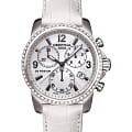Стальной безельБезельВнешний ободок, закрепляющий стекло. В спортивных часах так называется поворотное кольцо с делениями на циферблате, выполняет роль таймера – замеряет отрезки времени на шкале. Неподвижный безель – элемент декора. Однонаправленно вращающийся безель на дайверских часах позволяет фиксировать моменты погружения и выныривания на поверхность. декорирован 60 бриллиантами оттенка Top Wesselton. Специалисты отмечают высокую точность хронографаХронографФункция позволяет измерять отрезки времени с особой точностью: часы, минуты, секунды. Верным признаком хронографа является наличие на циферблате 3 дополнительных окошек-счётчиков. благодаря швейцарскому кварцевому механизму ETA 251.471. Белый ремешок выполнен из натуральной кожи, стрелки имеют люминесцентную подсветкуЛюминесцентное покрытиеПозволяет считывать показания времени в темноте. Производители наносят на стрелки, часовые индексы, безель или поверхность циферблата светонакопительный состав, дающий холодное свечение..