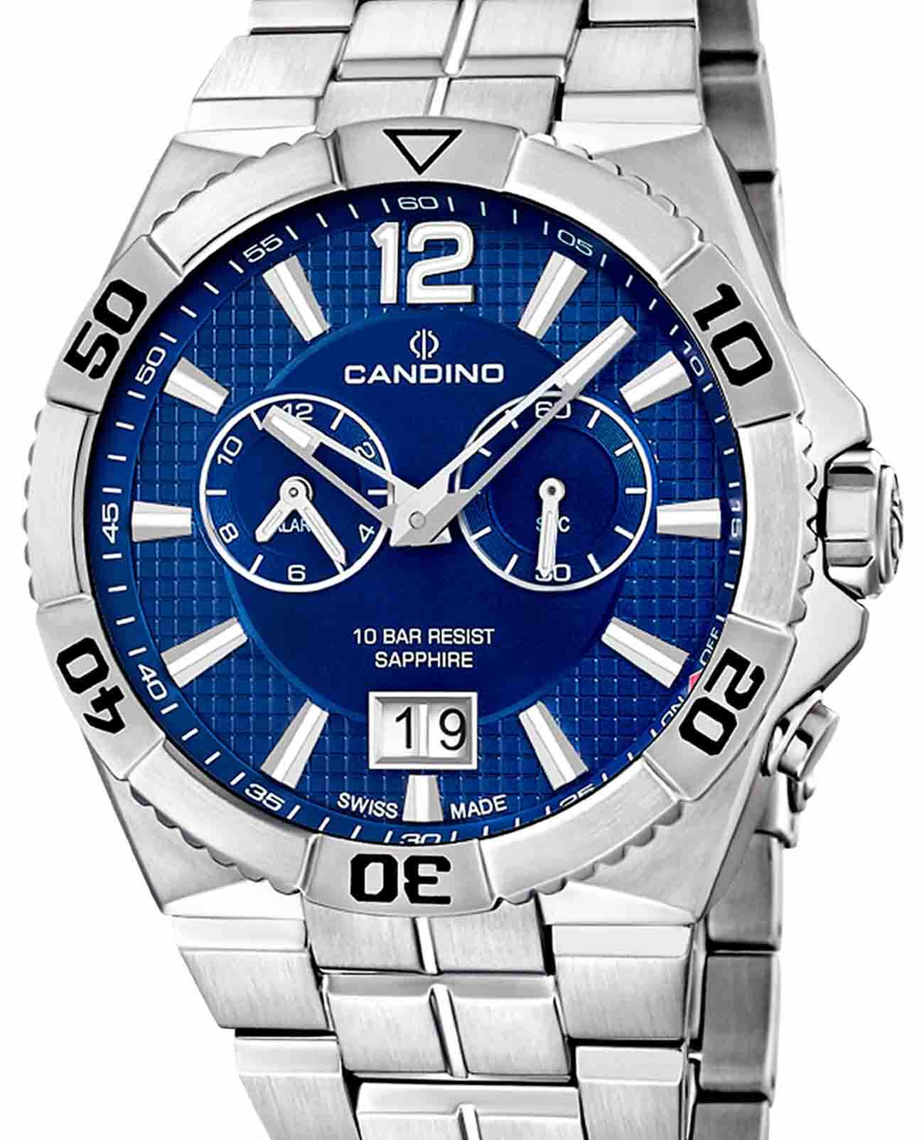 Мужские наручные часы Candino C4450/A из коллекции Sportive сочетают в себе спортивный дизайн и надежность швейцарского качества. Модель обладает круглым корпусом, изготовленным из нержавеющей стали, что обеспечивает высокую устойчивость к внешним воздействиям. Браслет из того же материала на раскладной застёжкеРаскладная застёжкаТакой тип застёжки используется только на браслетах из металла. Она никогда не раскрывается полностью, происходит разделение на 2 и более частей. Раскладывающая застёжка снизит вероятность потери часов к минимуму.. Синий циферблат дополнен окном даты и оснащен люминесцентными стрелками и меткамиЛюминесцентное покрытиеПозволяет считывать показания времени в темноте. Производители наносят на стрелки, часовые индексы, безель или поверхность циферблата светонакопительный состав, дающий холодное свечение., обеспечивающими отличную видимость в темноте . Для защиты используется сапфировое стеклоСапфировое стеклоПрочный и надёжный материал из кристалла сапфира синтетического происхождения, характеризующийся особой твёрдостью и устойчивостью к царапинам и повреждениям., которое обеспечивает прочную защиту от царапин и антибликовый эффект. Часы работают на кварцевом механизме, что гарантирует точное время без необходимости подзаводки. Водонепроницаемость модели достигает 100 метров (10 атмосфер), что позволяет использовать их во время плавания и других водных видов спорта .