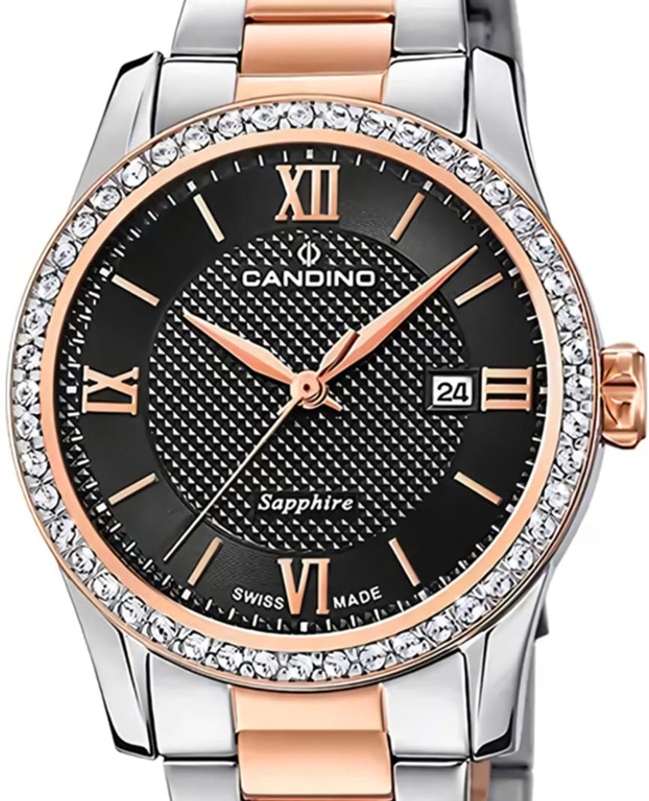 Женские швейцарские часы Candino Elegance C4741/4, это классические женские часы из коллекции Lady Elegance. Сапфировое стеклоСапфировое стеклоПрочный и надёжный материал из кристалла сапфира синтетического происхождения, характеризующийся особой твёрдостью и устойчивостью к царапинам и повреждениям. используется в дорогостоящих изделиях, это лучшее стекло для наручных часов, которое не царапается при механическом воздействии, его можно повредить только алмазом. Браслет часов изготовлен из стали с частичным PVD-покрытиемPVDУльтратонкое покрытие наносится в технике вакуумного напыления, сочетает в себе нитрид титана особой прочности со слоем золота или оксида хрома. Несёт в себе декоративную или защитную функцию., механизм — кварц. Кварцевые часы всегда точнее механических. В среднем, погрешность хода составляет 20 секунд в месяц. Кварцевые часы не нужно заводить, только менять батарейку раз в несколько лет. Класс водозащиты: 50 метров, позволит защитить корпус от случайных брызг или капель дождя.