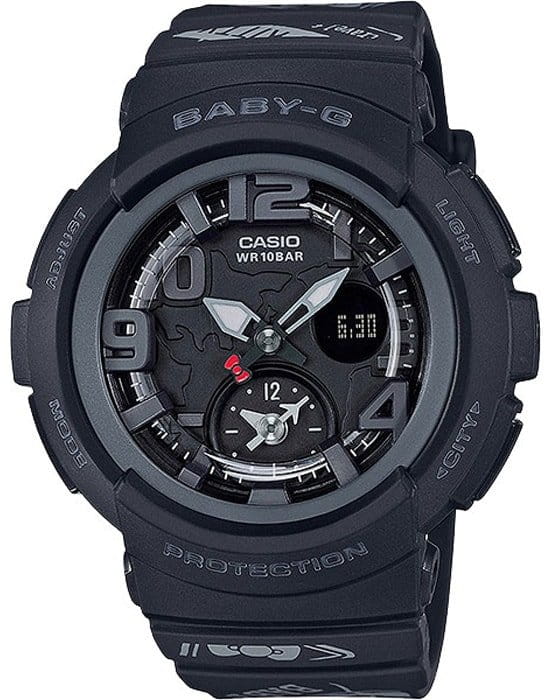 Baby-G Hello Kitty. Лимитированная серия. Циферблат подсвечивается светодиодом. Противоударный корпус защищает механизм от ударов и вибрации. Мировое время – 48 городов (31 часовой пояс), всемирное координированное время (UTC). Автоматический переход на зимнее и летнее время, возможность включения/отключения данной функции. 12-ти и 24-х часовой формат времени. Секундомер с точностью показаний 1с и временем измерения 1ч. Сплит-хронограф. Таймер обратного отсчета от 1мин до 1ч. Функция перемещения стрелок. Функция включения/отключения звука.