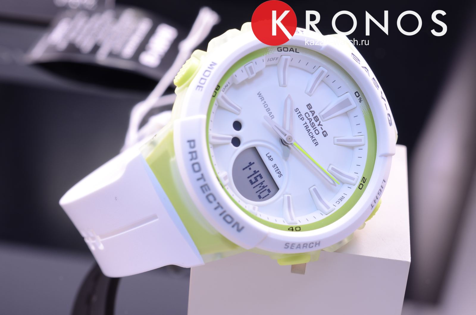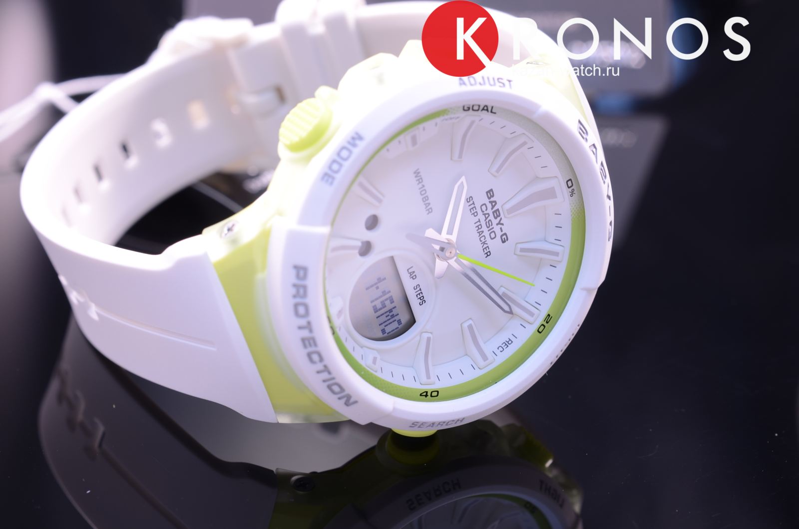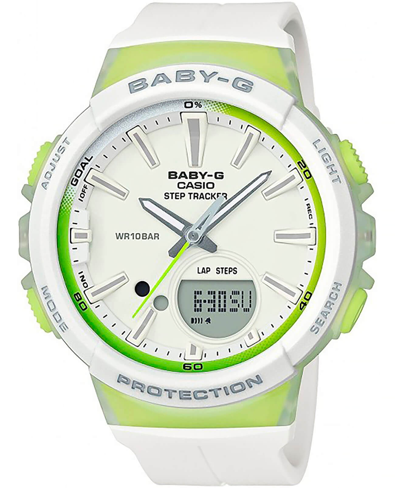 Наручные часы с зелёными деталями оснащены шагомером, счётчик измеряет количество шагов от 0 до 999999. Предусмотрена возможность установить цель на день. Размечена специальная шкала вокруг безеляБезельВнешний ободок, закрепляющий стекло. В спортивных часах так называется поворотное кольцо с делениями на циферблате, выполняет роль таймера – замеряет отрезки времени на шкале. Неподвижный безель – элемент декора. Однонаправленно вращающийся безель на дайверских часах позволяет фиксировать моменты погружения и выныривания на поверхность., достижение отметки «Goal» означает, что план выполнен. Ударопрочный корпусУдаропрочный корпусМеханизм заключён в корпус, выполненный из современных материалов, устойчивых к ударам, механическим повреждениям и падению с высоты: инновационный пластик, карбон, нержавеющая сталь, титан. сделан из прочного полимера, устойчив к падению, вибрации. Работу японского кварцевого механизма обеспечивает батарейка, рассчитанная на 2 года. Минеральное закаленное стекло. Светодиодная подсветкаСветодиодная подсветкаСветодиодная или LED-подсветка обеспечивает появление яркого холодного свечения за счёт LED-элементов - маленьких лампочек. Они потребляют минимальное количество энергии, чаще всего можно встретить 1 светодиод, в нижней части циферблата.. Водостойкость 10 бар. Включение и выключение звука кнопок. Автокалендарь, будильник, секундомер, таймер обратного отсчёта. Указание второго часового пояса. Габариты: 42,6 x 45,2 x 13,3 мм.