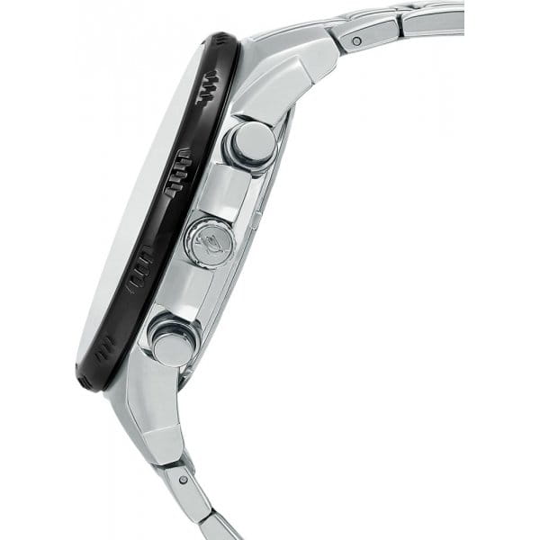 Массивная модель выполнена в автомобильной стилистике, благодаря внушительному ударопрочному корпусуУдаропрочный корпусМеханизм заключён в корпус, выполненный из современных материалов, устойчивых к ударам, механическим повреждениям и падению с высоты: инновационный пластик, карбон, нержавеющая сталь, титан. она отлично смотрится на широком мужском запястье. Чёрно-серебристая расцветка всегда останется актуальной. Японский высокоточный кварцевый калибр. Продолжительный срок службы батарейки - 5 лет. Электролюминесцентная подсветкаЭлектролюминесцентная подсветкаЭлектролюминесцентная панель устанавливается под ЖК-экраном часов, при нажатии кнопки электричество преобразуется в свет за счёт подачи напряжения на атомы фосфора, такой тип подсветки позволяет освещать весь циферблат.. Минеральное стекло. Водостойкость до 10 бар. БезельБезельВнешний ободок, закрепляющий стекло. В спортивных часах так называется поворотное кольцо с делениями на циферблате, выполняет роль таймера – замеряет отрезки времени на шкале. Неподвижный безель – элемент декора. Однонаправленно вращающийся безель на дайверских часах позволяет фиксировать моменты погружения и выныривания на поверхность. с IP-покрытиемIP-покрытиеМетод ионного напыления. Демонстрирует повышенную устойчивость к истиранию, окислению и химическим веществам. Под воздействием высокого давления и температуры около 1500°C молекулы металла надёжно соединяются с частицами корпуса часов.. Нержавеющая сталь 316L. Отображение числа и дня недели, хронографХронографФункция позволяет измерять отрезки времени с особой точностью: часы, минуты, секунды. Верным признаком хронографа является наличие на циферблате 3 дополнительных окошек-счётчиков., секундомер, тахиметрТахиметрРазмеченная шкала, располагается на ободке или безеле часов. Тахиметр позволяет рассчитать скорость на определённом участке пути, расстояние измеряется в километрах или милях.. Габариты: 56,9 x 50,3 x 12,9 мм.