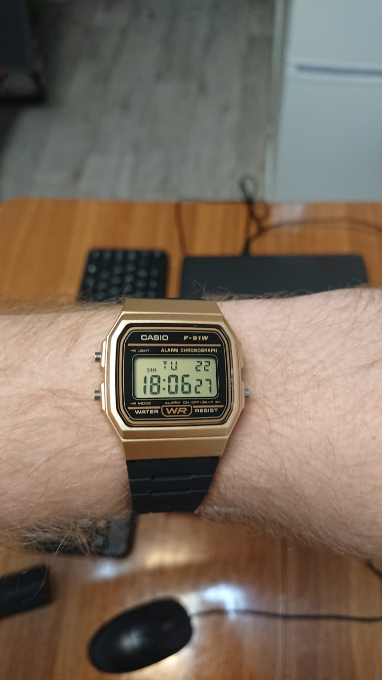 Электронные часы в чёрно-золотом исполнении напоминают первые модели от Casio благодаря винтажному 8-угольному ударопрочному корпусуУдаропрочный корпусМеханизм заключён в корпус, выполненный из современных материалов, устойчивых к ударам, механическим повреждениям и падению с высоты: инновационный пластик, карбон, нержавеющая сталь, титан., сделанному из надёжного пластика. Аксессуар с кварцевым механизмом работает от батарейки, характеризующейся высоким сроком службы - до 7 лет. Циферблат оснащён светодиодной микроподсветкойСветодиодная подсветкаСветодиодная или LED-подсветка обеспечивает появление яркого холодного свечения за счёт LED-элементов - маленьких лампочек. Они потребляют минимальное количество энергии, чаще всего можно встретить 1 светодиод, в нижней части циферблата., освещающей его сбоку. Органическое стекло легко полируется. Гибкий полимерный ремешок. Ежедневный будильник, секундомер, автоматический календарь, 12 и 24-х часовое отображение времени. Габариты: 33,2 x 38 x 8,5 мм.