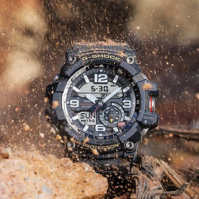 Аксессуар серии Mudmaster отличаются массивным внешним видом, брутальным дизайном и продуманным расположением всех элементов. Тёмное исполнение позволяет экспериментировать с оттенками используемой одежды. Часы отличаются устойчивостью к пыли и грязи, противоударный корпусУдаропрочный корпусМеханизм заключён в корпус, выполненный из современных материалов, устойчивых к ударам, механическим повреждениям и падению с высоты: инновационный пластик, карбон, нержавеющая сталь, титан. защищает японский кварцевый механизм от механических повреждений, вибрации, падения. Батарейка рассчитана на 2 года службы. Водостойкость 20 бар. Автоматическая светодиодная подсветкаСветодиодная подсветкаСветодиодная или LED-подсветка обеспечивает появление яркого холодного свечения за счёт LED-элементов - маленьких лампочек. Они потребляют минимальное количество энергии, чаще всего можно встретить 1 светодиод, в нижней части циферблата.. Закаленное минеральное стеклоМинеральное стеклоМинеральное стекло представляет собой искусственно выращенный минерал кварца. Такое стекло отличается особой устойчивостью к повреждениям и царапинам. Уступает по некоторым качествам сапфировому стеклу.. Светонакопительное покрытие NeobriteПодсветка NeobriteИспользование светонакопительных составов на основе сульфида цинка или алюмината стронция, яркий свет можно наблюдать на протяжении 6-10 часов после «зарядки» часов около источника света.. При движении руки дисплей освещается ярким светом. Включение и выключение звука кнопок. Термометр -10°C /+60°C, цифровой компас, мировое времяМировое время Полезное часовое усложнение, отображающее время в основных городах и известных областях по всему миру, оно связано с часовыми поясами, удобно для путешественников и бизнесменов. , координированное время UTCUTCВсемирное кординационное время, не имеющее привязки к географическому положению Гринвича, основывается на атомном отсчёте времени. Регулировка времени осуществляется более точно, чем устаревшее GMT.