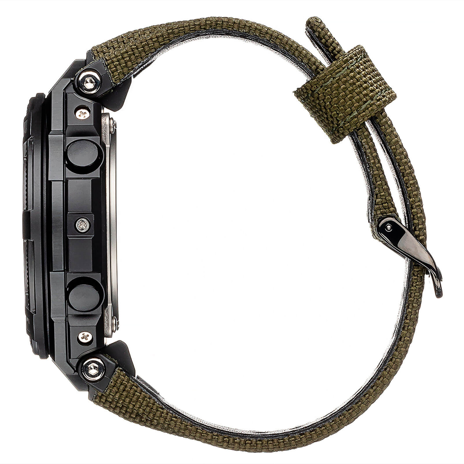 Тёмный циферблат имеет крупную индикацию времени, что обеспечивает отличную читаемость показателей даже при беглом взгляде. Особенностью аксессуара стал ремешок из инновационного материала Cordura в цвете хаки, он обладает большей прочностью и устойчивостью к износу. Наручные часы могут похвастаться ударопрочным корпусомУдаропрочный корпусМеханизм заключён в корпус, выполненный из современных материалов, устойчивых к ударам, механическим повреждениям и падению с высоты: инновационный пластик, карбон, нержавеющая сталь, титан. из стали и пластика, выдерживающим любые нагрузки. Они не нуждаются в заводе благодаря технологии питания от солнечного света . Закаленное минеральное стекло. Водозащита 200 метров. Уведомление звуковым сигналом о наступлении каждого часа. Частичное IP-покрытиеIP-покрытиеМетод ионного напыления. Демонстрирует повышенную устойчивость к истиранию, окислению и химическим веществам. Под воздействием высокого давления и температуры около 1500°C молекулы металла надёжно соединяются с частицами корпуса часов.. Автоматическая светодиодная подсветкаСветодиодная подсветкаСветодиодная или LED-подсветка обеспечивает появление яркого холодного свечения за счёт LED-элементов - маленьких лампочек. Они потребляют минимальное количество энергии, чаще всего можно встретить 1 светодиод, в нижней части циферблата.. Секундомер, 5 будильников, мировое времяМировое время Полезное часовое усложнение, отображающее время в основных городах и известных областях по всему миру, оно связано с часовыми поясами, удобно для путешественников и бизнесменов. , таймер, хронографХронографФункция позволяет измерять отрезки времени с особой точностью: часы, минуты, секунды. Верным признаком хронографа является наличие на циферблате 3 дополнительных окошек-счётчиков., календарь, UTCUTCВсемирное кординационное время, не имеющее привязки к географическому положению Гринвича, основывается на атомном отсчёте времени. Регулировка времени осуществляется более точно, чем устаревшее GMT.