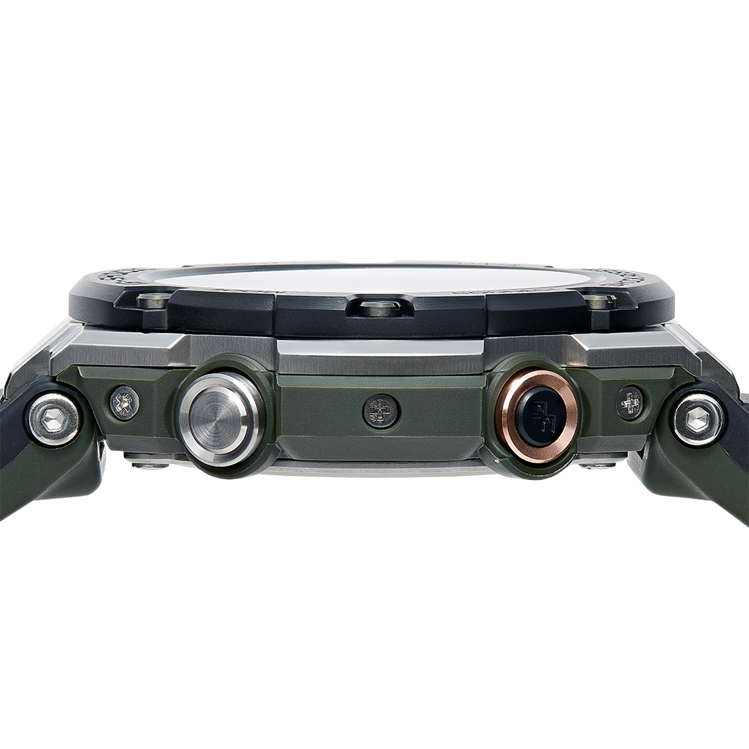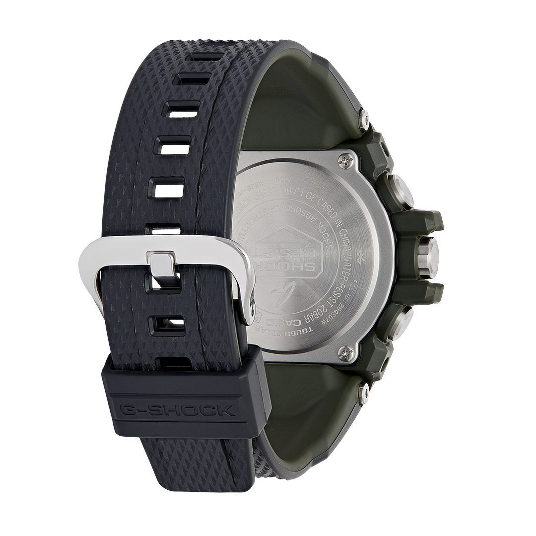 Наручные часы выпущены в брутальном, слегка агрессивном дизайне. Они оформлены в чёрном цвете, ярким элементом стал оранжевый счётчик на метке 9 часов, имитирующий турбину двигателя самолёта. Окошко предназначено для контроля уровня заряда батарейки, чем больше цвета видно, тем выше необходимость поставить часы на подзарядку. Модель серии G-Steel оснащена японским кварцевым механизмом, получаемым энергию для работы от источников света. Так реализуется технология . Аксессуар наделён противоударным корпусомУдаропрочный корпусМеханизм заключён в корпус, выполненный из современных материалов, устойчивых к ударам, механическим повреждениям и падению с высоты: инновационный пластик, карбон, нержавеющая сталь, титан. из полимера и стали 316L, что позволяет усилить конструкцию. На стрелки нанесено люминесцентное покрытиеЛюминесцентное покрытиеПозволяет считывать показания времени в темноте. Производители наносят на стрелки, часовые индексы, безель или поверхность циферблата светонакопительный состав, дающий холодное свечение., аналоговый циферблат подсвечивается светодиодомСветодиодная подсветкаСветодиодная или LED-подсветка обеспечивает появление яркого холодного свечения за счёт LED-элементов - маленьких лампочек. Они потребляют минимальное количество энергии, чаще всего можно встретить 1 светодиод, в нижней части циферблата.. Синхронизация со смартфоном BluetoothBluetoothСовременная технология, позволяющая синхронизировать часы с телефоном и переносить данные. Часы с Bluetooth расширяют возможности вашего смартфона и делают его использование ещё более удобным. позволяет устанавливать точное время, настраивать параметры будильника, мирового времениМировое время Полезное часовое усложнение, отображающее время в основных городах и известных областях по всему миру, оно связано с часовыми поясами, удобно для путешественников и бизнесменов. . Функции: ежедневный будильник, секундомер, хронографХронографФункция позволяет измерять отрезки времени с особой точностью: часы, минуты, секунды. Верным признаком хронографа является наличие на циферблате 3 дополнительных окошек-счётчиков., таймер, вечный календарьВечный календарьКлассическое часовое усложнение, представляющее собой календарь, рассчитанный на несколько лет вперёд (стандартно – до 2099 года). Определяет текущую дату, день недели, месяц.. Габариты: 58,1мм x 53,8мм x 14,1ммp>