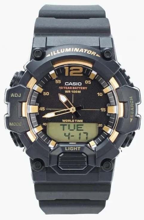 Спортивные японские мужские наручные часы с хронографомХронографФункция позволяет измерять отрезки времени с особой точностью: часы, минуты, секунды. Верным признаком хронографа является наличие на циферблате 3 дополнительных окошек-счётчиков. Casio Collection HDC-700-9A, кварцевый механизм с высокой точностью. Класс водозащиты: 100 метров, позволит плавать, нырять и заниматься другими водными видами спорта. Корпус часов изготовлен из пластика. Пластиковый ремешок на стандартной застёжке. Циферблат подсвечивается светодиодомСветодиодная подсветкаСветодиодная или LED-подсветка обеспечивает появление яркого холодного свечения за счёт LED-элементов - маленьких лампочек. Они потребляют минимальное количество энергии, чаще всего можно встретить 1 светодиод, в нижней части циферблата.. Записная книжка на 30 ячеек памяти для записи имен и телефонных номеров, каждая запись может включать в себя текст из 8 букв и 16 цифр. Мировое времяМировое время Полезное часовое усложнение, отображающее время в основных городах и известных областях по всему миру, оно связано с часовыми поясами, удобно для путешественников и бизнесменов. – 30 городов (29 часовых поясов). Функция включения/отключения летнего времени. 12-ти и 24-х часовой формат времени. СекундомерСекундомерСекундоме́р — прибор, способный измерять интервалы времени с точностью до долей секунды. с точностью показаний 1/100с и временем измерения 24ч. Сплит-хронографХронографФункция позволяет измерять отрезки времени с особой точностью: часы, минуты, секунды. Верным признаком хронографа является наличие на циферблате 3 дополнительных окошек-счётчиков.. ТаймерТаймерОтсчитывает секунды в обратном направлении в заданном интервале времени. обратного отсчета от 1мин до 24ч. Функция включения/отключения звука.