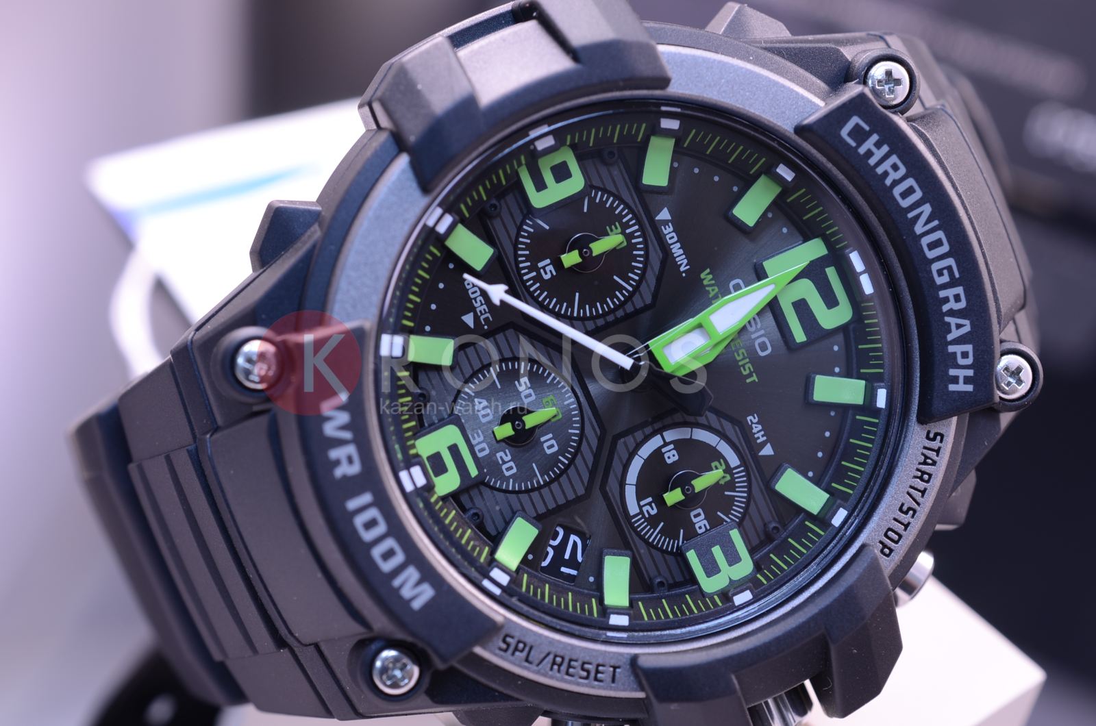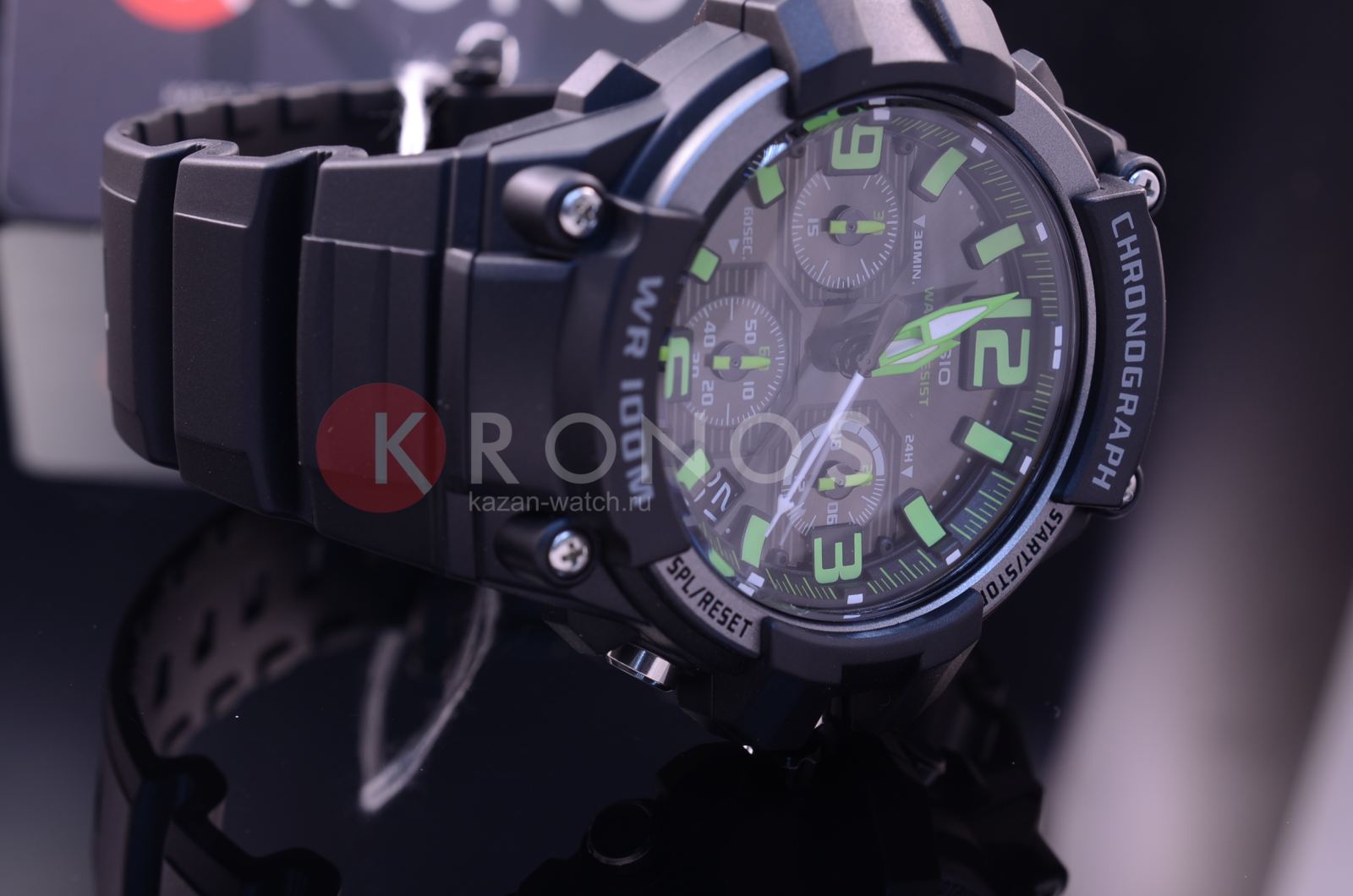 В часах имеется хронограф. Корпус и браслет черного цвета выполнены из высококачественных полимерных материалов. На дисплее отображается текущая дата. Изделие надежно защищено выпуклым акриловым стеклом. Высокая точность информации - прошедшее время отображается с точностью до доли секунды. Информация на дисплее четко видна даже в темное время суток благодаря неоновому покрытию. Высокая водонепроницаемость, которая составляет 10 Бар.