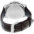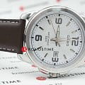 Белый циферблат с серебристыми часовыми метками и стрелками позволяет использовать часы в сочетании с одеждой любого цвета. Корпус из гипоаллергенной латуни отличается лёгкостью, коричневый ремешок из натуральной кожи надёжно обхватывает запястье. Срок службы батарейки для питания кварцевого механизма - 3 года. Люминесцентная подсветкаЛюминесцентное покрытиеПозволяет считывать показания времени в темноте. Производители наносят на стрелки, часовые индексы, безель или поверхность циферблата светонакопительный состав, дающий холодное свечение.. Сохранение водонепроницаемости при давлении до 5 бар. Минеральное стекло. Габариты: 44,9 x 50 x 9,4 мм.