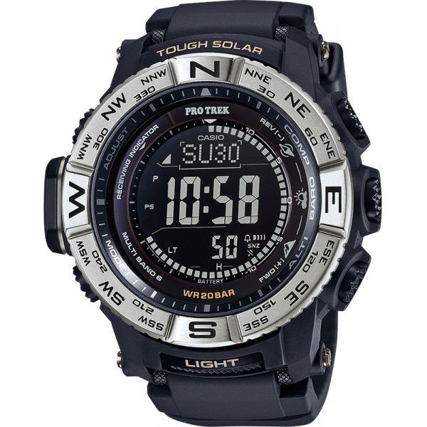 Многофункциональные японские мужские наручные часы. Круглый корпус часов выполнен из темного пластика, безель из стали, резиновый браслет. Инверсионный, жидкокристаллический дисплей. Часы оснащены такими дополнительными функциями как секундомер, таймер обратного отсчета, высотометр, термометр, компас, альтиметр. Минеральное стекло, устойчивое к появлению царапин. Магнитоустойчивая, ударопрочная модель. Источником энергии служат солнечные батареи. Синхронизация времени по радиосигналу.