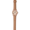 Брендовый аксессуар с отдельными мини-счётчиками выполнен в классическом стиле, крупные римские цифры создают винтажное настроение. Лаконичный циферблат декорирован стразами Swarovski, придающие вашему образу элемент роскоши. Высокоточный кварцевый механизм работает от батарейки, устраняя необходимость завода. Аккумулятор рассчитан на 3 года безупречной работы. Стильно смотрится коричневый ремешок из натуральной кожи. Люминесцентное покрытиеЛюминесцентное покрытиеПозволяет считывать показания времени в темноте. Производители наносят на стрелки, часовые индексы, безель или поверхность циферблата светонакопительный состав, дающий холодное свечение. стрелок. IP-покрытиеIP-покрытиеМетод ионного напыления. Демонстрирует повышенную устойчивость к истиранию, окислению и химическим веществам. Под воздействием высокого давления и температуры около 1500°C молекулы металла надёжно соединяются с частицами корпуса часов. корпуса с розоватым отливом. Минеральное стекло. Функция календаря. Габариты: 39,3 x 44,5 x 8,6 мм.