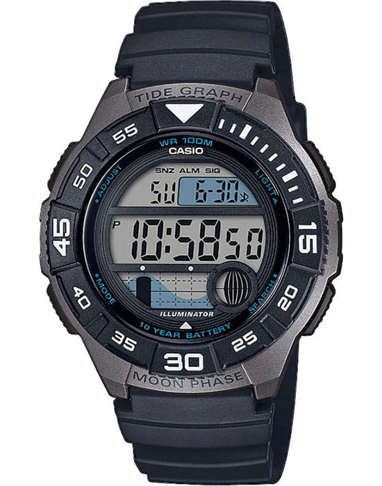 Электролюминесцентная подсветка освещает весь циферблат, после отпускания кнопки свечение продолжается еще некоторое время. Мировое время с дополнительным циферблатом, который позволяет настроить выбор места и времени второго часового пояса и при необходимости вывести на экран. Второй часовой пояс. 12-ти и 24-х часовой формат времени. Отображение возраста и фазы Луны. Графически отображаются сведения о приливах и отливах, основанные на широте и долготе. Секундомер с точностью показаний 1/100с и временем измерения 24ч. Сплит-хронограф. Таймер обратного отсчета от 1мин до 24ч с автоповтором. Безель вращается в одном направлении. Типы сигналов: ежедневный, ежемесячный, каждый день определенного месяца, на определенную дату. Функция включения/отключения звука.