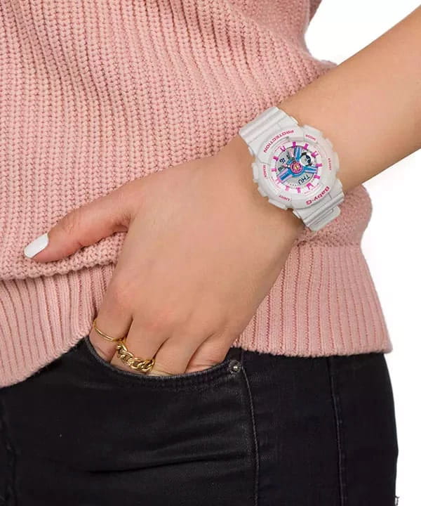 Современные надежные японские наручные женские часы Casio Baby-G BA-110NR-8A. Точность хода: не хуже +/-15 секунд в месяц. Светодиодная подсветкаСветодиодная подсветкаСветодиодная или LED-подсветка обеспечивает появление яркого холодного свечения за счёт LED-элементов - маленьких лампочек. Они потребляют минимальное количество энергии, чаще всего можно встретить 1 светодиод, в нижней части циферблата. с функцией автоматической подсветки при наклоне часов. Функция cекундомераСекундомерСекундоме́р — прибор, способный измерять интервалы времени с точностью до долей секунды.. Таймер обратного отсчета. 5 ежедневных будильников. Автоматический календарь. Функция мирового времени. Отображение времени в 12-часовом или 24-часовом формате. Особая ударопрочная конструкция защищает от ударов и вибрации. Минеральное стеклоМинеральное стеклоМинеральное стекло представляет собой искусственно выращенный минерал кварца. Такое стекло отличается особой устойчивостью к повреждениям и царапинам. Уступает по некоторым качествам сапфировому стеклу. устойчивое к появлению царапин, обладающее высокой прозрачностью. Ремешок из полимерного материала. Натуральный полимерный материал является идеальным для изготовления ремешка благодаря своей чрезвычайной прочности и гибкости. Корпус выполнен из высококачественного пластика. Задняя крышка стальная. Класс водозащиты: 100 метров, позволит плавать, нырять и заниматься другими водными видами спорта.