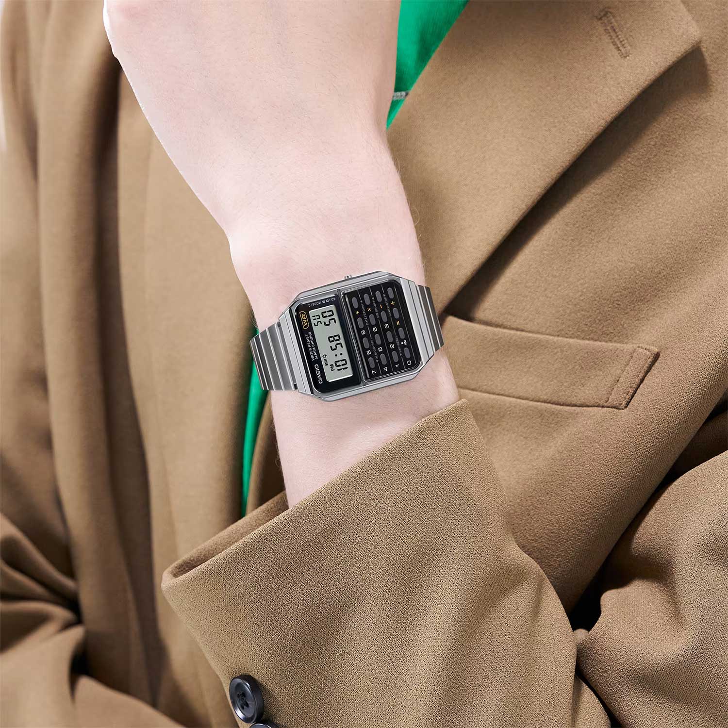 Японские унисекс часы с хронографом Casio Vintage CA-500WE-1A, кварцевый механизм с высокой точностью. Корпус часов изготовлен из пластика, серебристого цвета. Светодиодная подсветкаСветодиодная подсветкаСветодиодная или LED-подсветка обеспечивает появление яркого холодного свечения за счёт LED-элементов - маленьких лампочек. Они потребляют минимальное количество энергии, чаще всего можно встретить 1 светодиод, в нижней части циферблата., секундомерСекундомерСекундоме́р — прибор, способный измерять интервалы времени с точностью до долей секунды. с точностью измерений 1/100 сек., общее время измерений 24 часа. Будильник с функцией Snooze. Автоматический календарь. 8-ми разрядный калькулятор. Класс водозащиты: 30 метров, позволит защитить корпус от случайных брызг или капель дождя. Браслет из стали на раскладной застёжкеРаскладная застёжкаТакой тип застёжки используется только на браслетах из металла. Она никогда не раскрывается полностью, происходит разделение на 2 и более частей. Раскладывающая застёжка снизит вероятность потери часов к минимуму.. Калькулятор позволяет производить различные математические вычисления, используя числа, содержащие до 8 знаков.