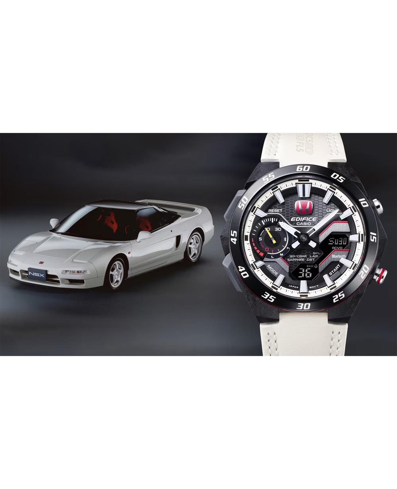 Мужские часы, дизайн которых вдохновлен воздушным потоком вокруг гоночного автомобиля. Многофункциональные японские мужские часы с BluetoothBluetoothСовременная технология, позволяющая синхронизировать часы с телефоном и переносить данные. Часы с Bluetooth расширяют возможности вашего смартфона и делают его использование ещё более удобным. Casio Edifice Windflow ECB-2200HTR-1A, кварцевый механизм с высокой точностью. Корпус часов изготовлен из карбона со стальной вставкой с IP-покрытиемIP-покрытиеМетод ионного напыления. Демонстрирует повышенную устойчивость к истиранию, окислению и химическим веществам. Под воздействием высокого давления и температуры около 1500°C молекулы металла надёжно соединяются с частицами корпуса часов.. Питание от солнечной энергии Tough SolarTough SolarТехнология основана на подзарядке аккумулятора от источника солнечного света, специальная панель улавливает солнечные лучи и преобразует их в энергию для работы часов. Достаточно пары минут нахождения на солнце для функционирования часов в течении суток. - солнечные батарейки большой мощности, индикатор заряда батареи. Функция автоматического сохранения энергии. Время работы аккумулятора без подзарядки приблизительно 7 месяцев, при включенной функции сохранения энергии приблизительно 18 месяцев. Двойная подcветка: циферблат и ЖК-дисплеи подсвечиваются светодиодомСветодиодная подсветкаСветодиодная или LED-подсветка обеспечивает появление яркого холодного свечения за счёт LED-элементов - маленьких лампочек. Они потребляют минимальное количество энергии, чаще всего можно встретить 1 светодиод, в нижней части циферблата., благодаря наличию функции задержки, после отпускания кнопки освещение горит еще несколько секунд. Настраиваемое послесвечение 1,5 или 3сек. Цвет подсветки: белый. Двойная светодиодная подсветкаСветодиодная подсветкаСветодиодная или LED-подсветка обеспечивает появление яркого холодного свечения за счёт LED-элементов - маленьких лампочек. Они потребляют минимальное количество энергии, чаще всего можно встретить 1 светодиод, в нижней части циферблата. (супер-подсветка, выбираемая продолжительность подсветки (1,5 секунды или 3 секунды), послесвечение). 12-ти и 24-х часовой формат времени. СекундомерСекундомерСекундоме́р — прибор, способный измерять интервалы времени с точностью до долей секунды. с двумя точностями показаний: 1/100с (до 1ч) и 1с (после 1ч) и временем измерения 24ч. Сплит-хронографСплит-хронографИспользуется для измерения продолжительности нескольких временных отрезков, начинающихся одновременно, а заканчивающихся в разное время.. ТаймерТаймерОтсчитывает секунды в обратном направлении в заданном интервале времени. обратного отсчета от 1с до 1ч. Мировое времяМировое время Полезное часовое усложнение, отображающее время в основных городах и известных областях по всему миру, оно связано с часовыми поясами, удобно для путешественников и бизнесменов. – 38 городов (38 часовых поясов), всемирное координированное время (UTCUTCВсемирное кординационное время, не имеющее привязки к географическому положению Гринвича, основывается на атомном отсчёте времени. Регулировка времени осуществляется более точно, чем устаревшее GMT.