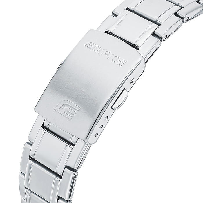 Японские мужские часы-хронографХронографФункция позволяет измерять отрезки времени с особой точностью: часы, минуты, секунды. Верным признаком хронографа является наличие на циферблате 3 дополнительных окошек-счётчиков. с секундомеромСекундомерСекундоме́р — прибор, способный измерять интервалы времени с точностью до долей секунды. Casio Edifice EFV-610D-5C, кварцевый механизм с высокой точностью. Класс водозащиты: 100 метров, позволит плавать, нырять и заниматься другими водными видами спорта. Корпус часов изготовлен из стали. Подсветка NeobriteПодсветка NeobriteИспользование светонакопительных составов на основе сульфида цинка или алюмината стронция, яркий свет можно наблюдать на протяжении 6-10 часов после «зарядки» часов около источника света. обеспечивает длительное послесвечение в темноте даже после кратковременного нахождения на свету. Часы-хронографХронографФункция позволяет измерять отрезки времени с особой точностью: часы, минуты, секунды. Верным признаком хронографа является наличие на циферблате 3 дополнительных окошек-счётчиков. с секундомеромСекундомерСекундоме́р — прибор, способный измерять интервалы времени с точностью до долей секунды. с точностью показаний 1/10с и временем измерения 1ч. Циферблат с метками в виде штрихов. Окошко даты находится в положении 3 часа. Задняя крышка с винтовым фиксатором. Батарея рассчитана на 3 года. Водонепроницаемость в соответствии с ISO 2281. Литой стальной браслет на раскладной застёжкеРаскладная застёжкаТакой тип застёжки используется только на браслетах из металла. Она никогда не раскрывается полностью, происходит разделение на 2 и более частей. Раскладывающая застёжка снизит вероятность потери часов к минимуму.. Предохранительная защелка на браслете препятствует случайному расстегиванию.