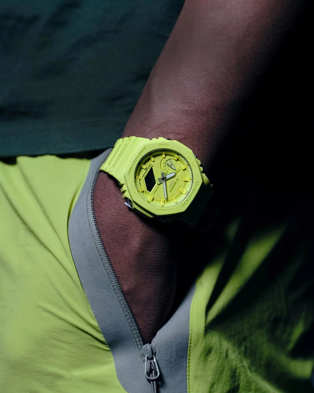 Мужские японские часы Casio G-Shock GA-2100-9A9DR (GA-2100-9A9) из противоударной коллекции G-Shock, отличаются невероятной лёгкостью и самым тонким корпусом среди всех представителей G-Shock в 11,8 мм. Оригинальный безельБезельВнешний ободок, закрепляющий стекло. В спортивных часах так называется поворотное кольцо с делениями на циферблате, выполняет роль таймера – замеряет отрезки времени на шкале. Неподвижный безель – элемент декора. Однонаправленно вращающийся безель на дайверских часах позволяет фиксировать моменты погружения и выныривания на поверхность. имеет форму октагона, часы являются современной интерпретацией модели DW-5000C. Ударопрочный корпусУдаропрочный корпусМеханизм заключён в корпус, выполненный из современных материалов, устойчивых к ударам, механическим повреждениям и падению с высоты: инновационный пластик, карбон, нержавеющая сталь, титан. характеризуется повышенной устойчивостью к ударам и повреждениям за счёт технологии Carbon Core GuardCarbon Core Guard Новейшая структура корпуса, разработанная Casio. Полиуретановая пластина дополнительно усилена карбоновыми вставками, что придаёт специальную защиту от механических повреждений. Карбон отличается лёгкостью и прочностью.. Ремешок из полимерного материала с обновлённым креплением. Функция складывания стрелок для чтения показателей с дисплеев. Мировое времяМировое время Полезное часовое усложнение, отображающее время в основных городах и известных областях по всему миру, оно связано с часовыми поясами, удобно для путешественников и бизнесменов. , секундомер, 5 будильников, автоматический календарь. Срок службы батарейки – 3 года. Габариты: 48,5 x 45,4 x 11,8 мм.