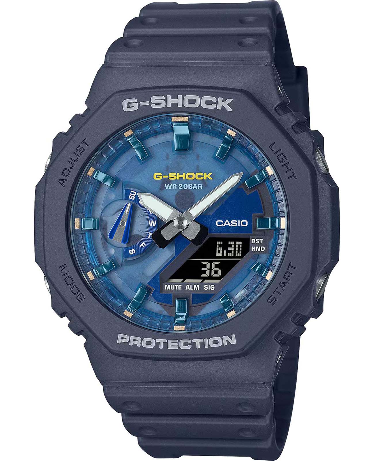 , есть функция включения/отключения летнего времени. Предусмотрено 5 будильников и ежечасный сигнал. Автоматический календарь отображает число, день недели и месяц, корректно работает до 2099 года. Для удобства просмотра информации реализована функция отключения звука и временного сдвига стрелок, чтобы не загораживать данные на цифровых дисплеях. Ремешок из пластика фиксируется на классической застёжке, предусмотрена система быстрой замены. Водонепроницаемость составляет , что позволяет использовать часы для плавания, ныряния и других водных видов спорта. Габаритные размеры — 45,4×48,5 мм, толщина — 11,8 мм, вес — 51 г. Батарея рассчитана на 3 года работы. Casio GA-2100AS-2A — это сочетание инновационных технологий, экологичности и фирменной прочности G-Shock для повседневного ношения и активного образа жизни.