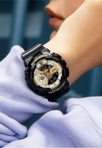Японские противоударные женские часы с хронографом Casio G-Shock GMA-S110GB-1ADR (GMA-S110GB-1A), электронный механизм с высокой точностью. Класс водозащиты: 200 метров, позволит плавать, нырять и заниматься другими водными видами спорта. Корпус часов изготовлен из пластика, цвета.