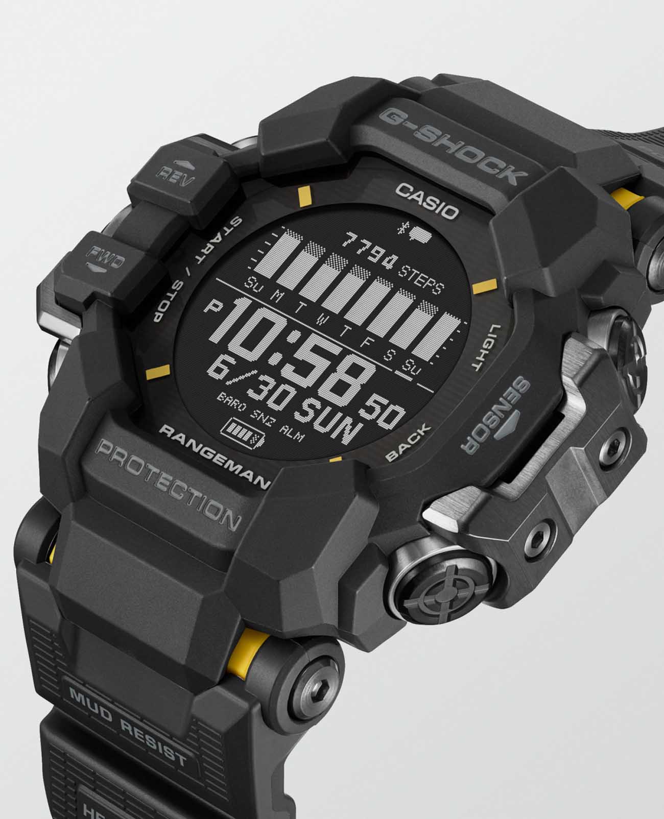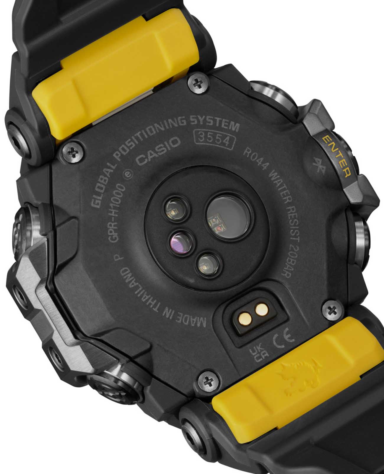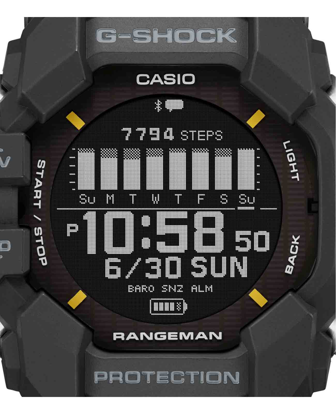Покоряйте сложные местности и чувствуйте себя потрясающе с этими прочными часами, такими же смелыми и активными, сколь и жесткими. Casio G-Shock GPR-H1000-1 разработаны для работы даже в самых суровых условиях, RANGEMAN GPR-H1000 из линейки MASTER of G - это действительно надежное снаряжение для активного отдыха. Благодаря грязезащитной конструкции, защищающей от попадания мелкой пыли и загрязнений, он рассчитан на работу в самых суровых условиях и при самых неблагоприятных погодных условиях. Эти мощные часы оснащены пульсометром, встроенной функцией GPS и ЖК-дисплеем с высокой четкостью изображения и высококонтрастной памятью в пикселях (MIP) для удобства чтения. Корпус защищен крупными металлическими деталями слева и справа, защищающими антенну GPSGPSСистема спутниковой навигации. Часы оснащены приёмником GPS-сигнала, который получает необходимую информацию по GSM, GPRS, со спутников. Принимая сигнал, наручные часы могут установить точные показатели времени и даты, часовой пояс, сообщить местоположение своего владельца.