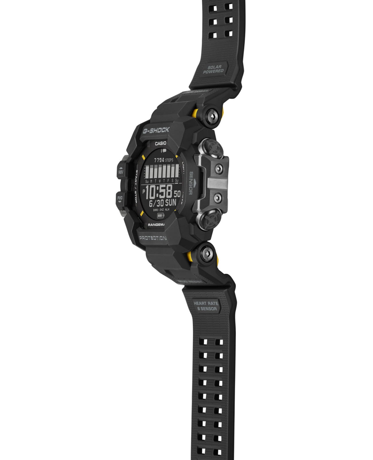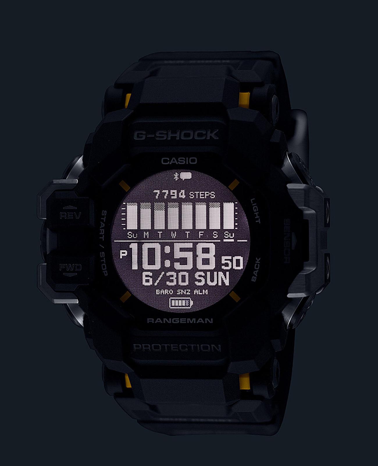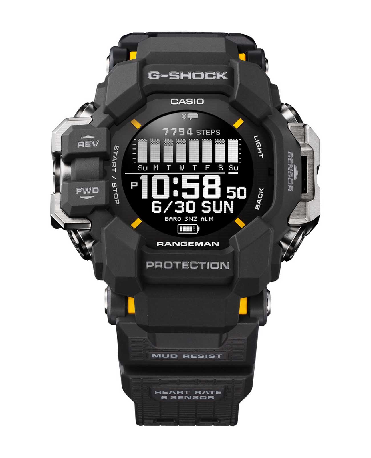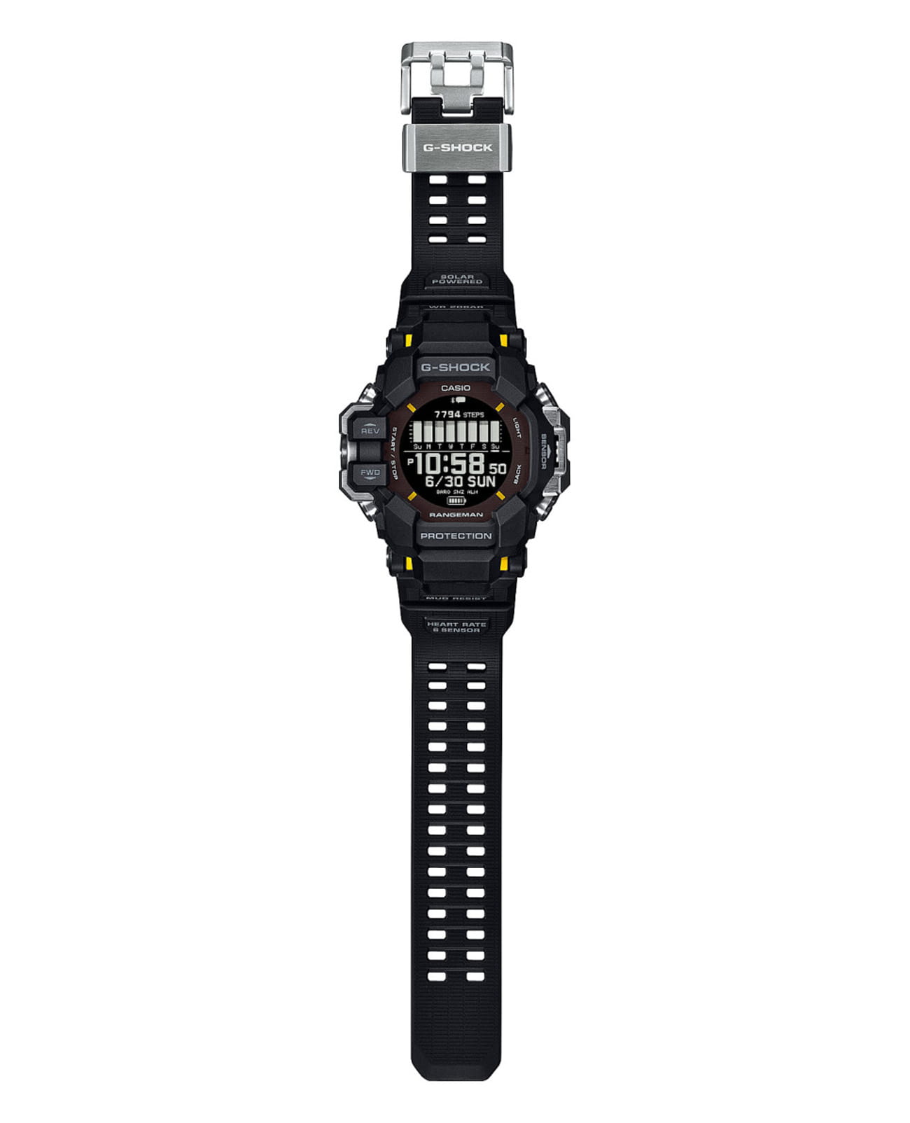Покоряйте сложные местности и чувствуйте себя потрясающе с этими прочными часами, такими же смелыми и активными, сколь и жесткими. Casio G-Shock GPR-H1000-1 разработаны для работы даже в самых суровых условиях, RANGEMAN GPR-H1000 из линейки MASTER of G - это действительно надежное снаряжение для активного отдыха. Благодаря грязезащитной конструкции, защищающей от попадания мелкой пыли и загрязнений, он рассчитан на работу в самых суровых условиях и при самых неблагоприятных погодных условиях. Эти мощные часы оснащены пульсометром, встроенной функцией GPS и ЖК-дисплеем с высокой четкостью изображения и высококонтрастной памятью в пикселях (MIP) для удобства чтения. Корпус защищен крупными металлическими деталями слева и справа, защищающими антенну GPSGPSСистема спутниковой навигации. Часы оснащены приёмником GPS-сигнала, который получает необходимую информацию по GSM, GPRS, со спутников. Принимая сигнал, наручные часы могут установить точные показатели времени и даты, часовой пояс, сообщить местоположение своего владельца.