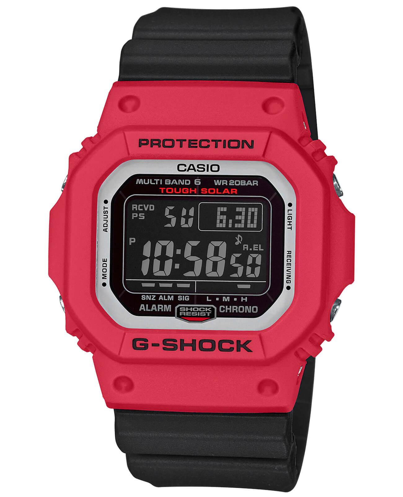 Вновь представлен тот самый 8-угольный противоударный корпусУдаропрочный корпусМеханизм заключён в корпус, выполненный из современных материалов, устойчивых к ударам, механическим повреждениям и падению с высоты: инновационный пластик, карбон, нержавеющая сталь, титан., ставший легендой. Часы в ярком исполнении выдерживают удары и падение с высоты, японский кварцевый механизм надёжно защищён от вибрации. Здесь реализуется технология питания от солнечного света , специальный индикатор позволяет следить за уровнем зарядки батареи. Минеральное стекло отличается устойчивостью к возникновению царапин. Электролюминесцентная подсветкаЭлектролюминесцентная подсветкаЭлектролюминесцентная панель устанавливается под ЖК-экраном часов, при нажатии кнопки электричество преобразуется в свет за счёт подачи напряжения на атомы фосфора, такой тип подсветки позволяет освещать весь циферблат. циферблата. Автоматическая корректировка времени по радиосигналу. Водонепроницаемость до 20 бар. Функции: хронографХронографФункция позволяет измерять отрезки времени с особой точностью: часы, минуты, секунды. Верным признаком хронографа является наличие на циферблате 3 дополнительных окошек-счётчиков., секундомер, таймер обратного отсчёта, мировое времяМировое время Полезное часовое усложнение, отображающее время в основных городах и известных областях по всему миру, оно связано с часовыми поясами, удобно для путешественников и бизнесменов. , 5 будильников, календарь. Габариты: 46,7 x 43,2 x 12,7 мм.