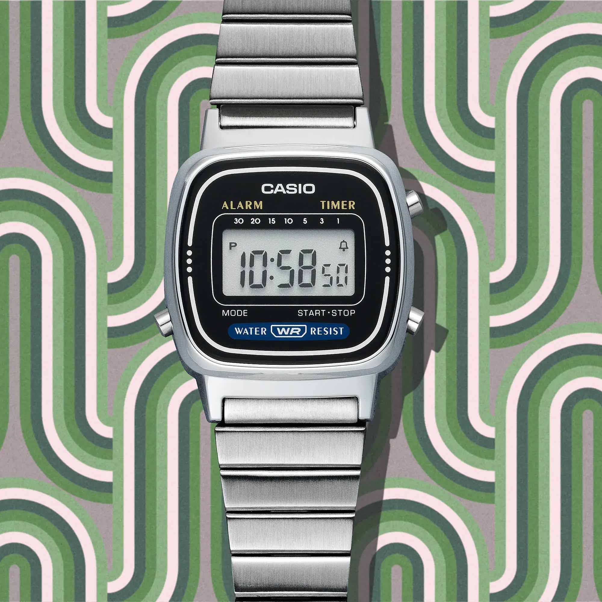 Модель LA670WA-1DF из коллекции Vintage сочетает в себе изысканный ретро-дизайн и практичность. Компактный корпус из полимерного материала с хромированным покрытием и браслет из нержавеющей стали с регулируемой застёжкойРаскладная застёжкаТакой тип застёжки используется только на браслетах из металла. Она никогда не раскрывается полностью, происходит разделение на 2 и более частей. Раскладывающая застёжка снизит вероятность потери часов к минимуму. обеспечивают удобство и долговечность.
