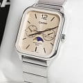 Японские мужские кварцевые часы с минеральным стекломМинеральное стеклоМинеральное стекло представляет собой искусственно выращенный минерал кварца. Такое стекло отличается особой устойчивостью к повреждениям и царапинам. Уступает по некоторым качествам сапфировому стеклу. Casio Collection MTP-M305D-9AVDF (MTP-M305D-9A), кварцевый механизм с высокой точностью. Корпус часов изготовлен из нержавеющей стали. Циферблат с метками в виде штрихов. Особенностью модели является наличие индикатора фазы луны над шестью часами по циферблату. Индикатор имеет 4 положения и отображается новолуние и полнолуние, а также растущую и убывающую Луну. Батарейка рассчитана на 3 года. Класс водозащиты: 50 метров, позволит защитить корпус от случайных брызг или капель дождя. Стальной браслет на раскладной застёжкеРаскладная застёжкаТакой тип застёжки используется только на браслетах из металла. Она никогда не раскрывается полностью, происходит разделение на 2 и более частей. Раскладывающая застёжка снизит вероятность потери часов к минимуму..